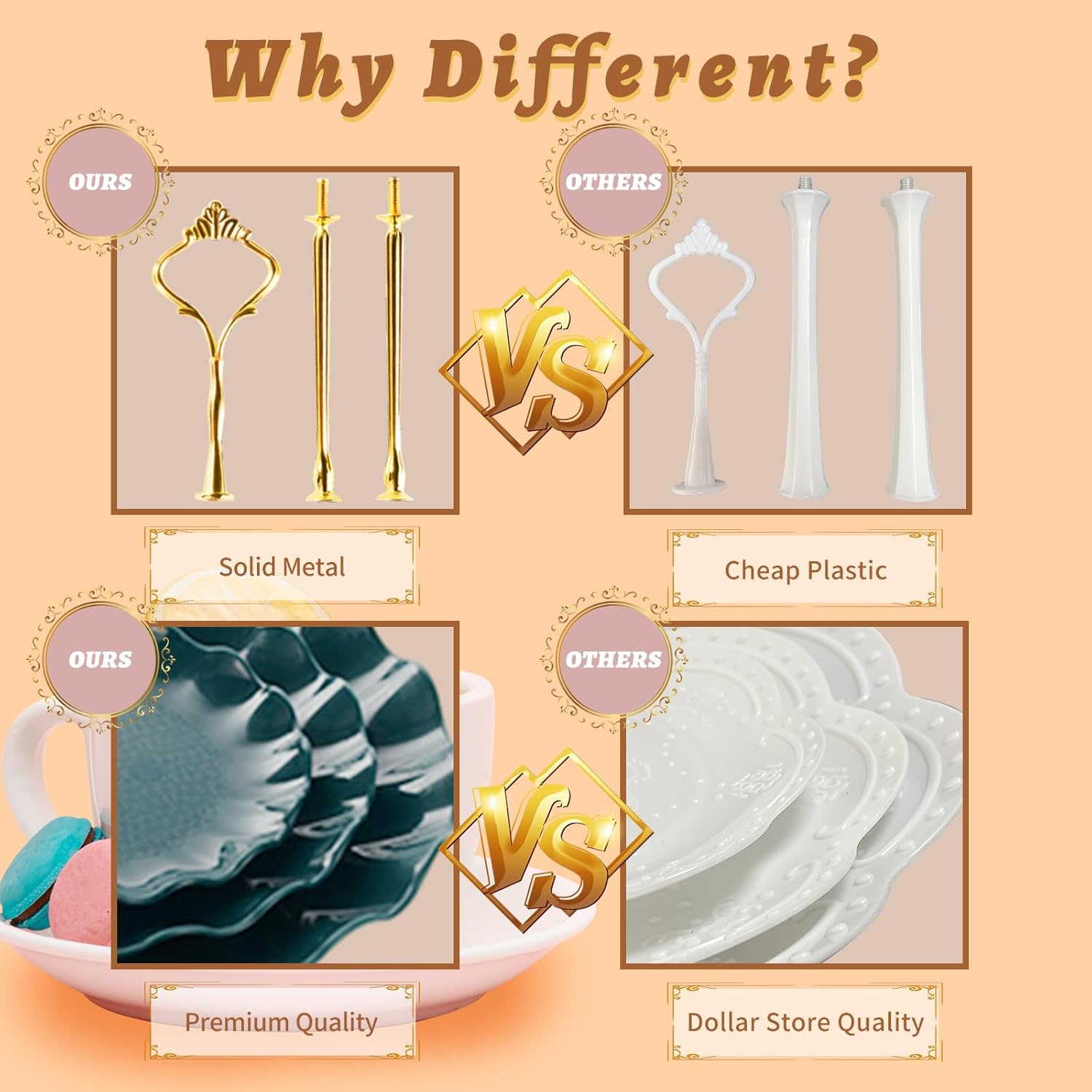 - Why Different: This cupcake stand is made of 4MM extra thick food grade plastic, much more better than 1mm dollar store quality. The bold metal rod also provide excellent texture and stability that can not be given by others
