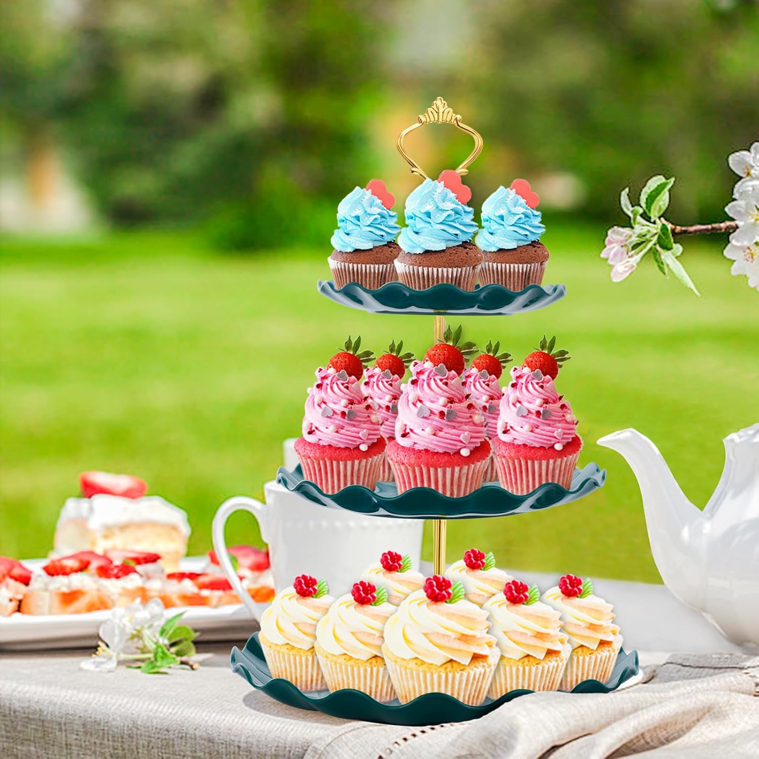 3 Tier Cupcake Stand Holder, Plastic Cup Cake Stand Tower with Tiered Serving Tray for Cupcakes, Donuts, Fruits and More (Green)