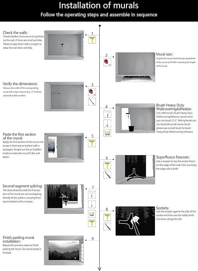 - Construction Installation: Each part of the mural is marked with a serial number underneath, no overlap, direct docking, in order. (Please refer to installation instructions)