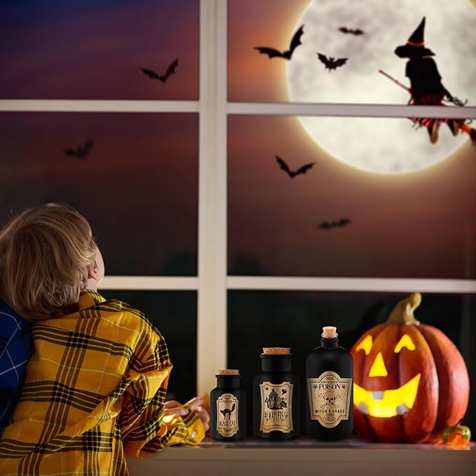 - Vintage Halloween Decorations Set: you will receive 3 pcs black Halloween glass potion bottles in different size, and 12 pcs spooky apothecary jars label; Add the stickers, and you will have awesome small potion jar decorations