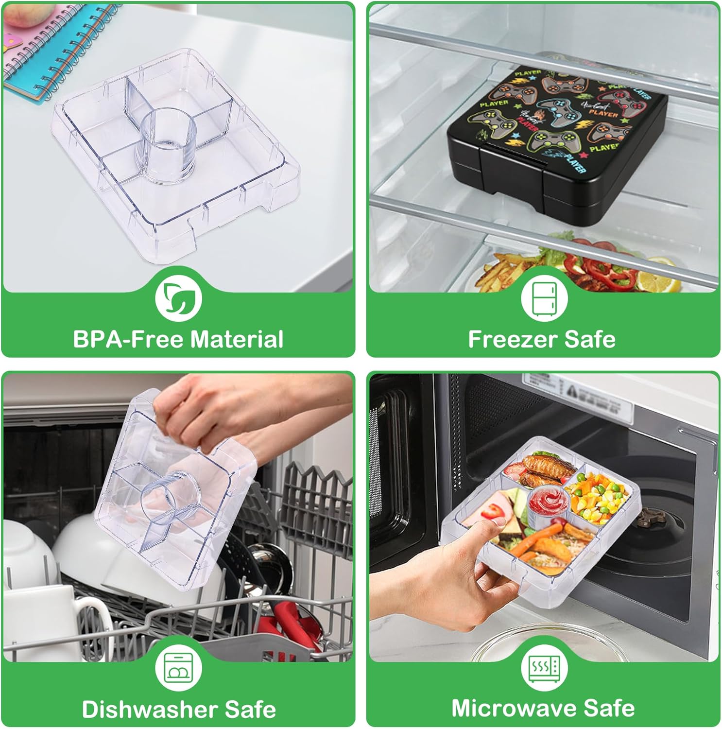 - Leak-Proof Bento Box and Food jar: Small bento box is divided up into 4 compartment, each sealed independently by one silicone seal, it can effectively prevent odor and let you eat the "original flavor" food. the middle round compartment can hold sauce. This food jar is 100% leak proof and perfect for packing school or work lunches as well as travel.