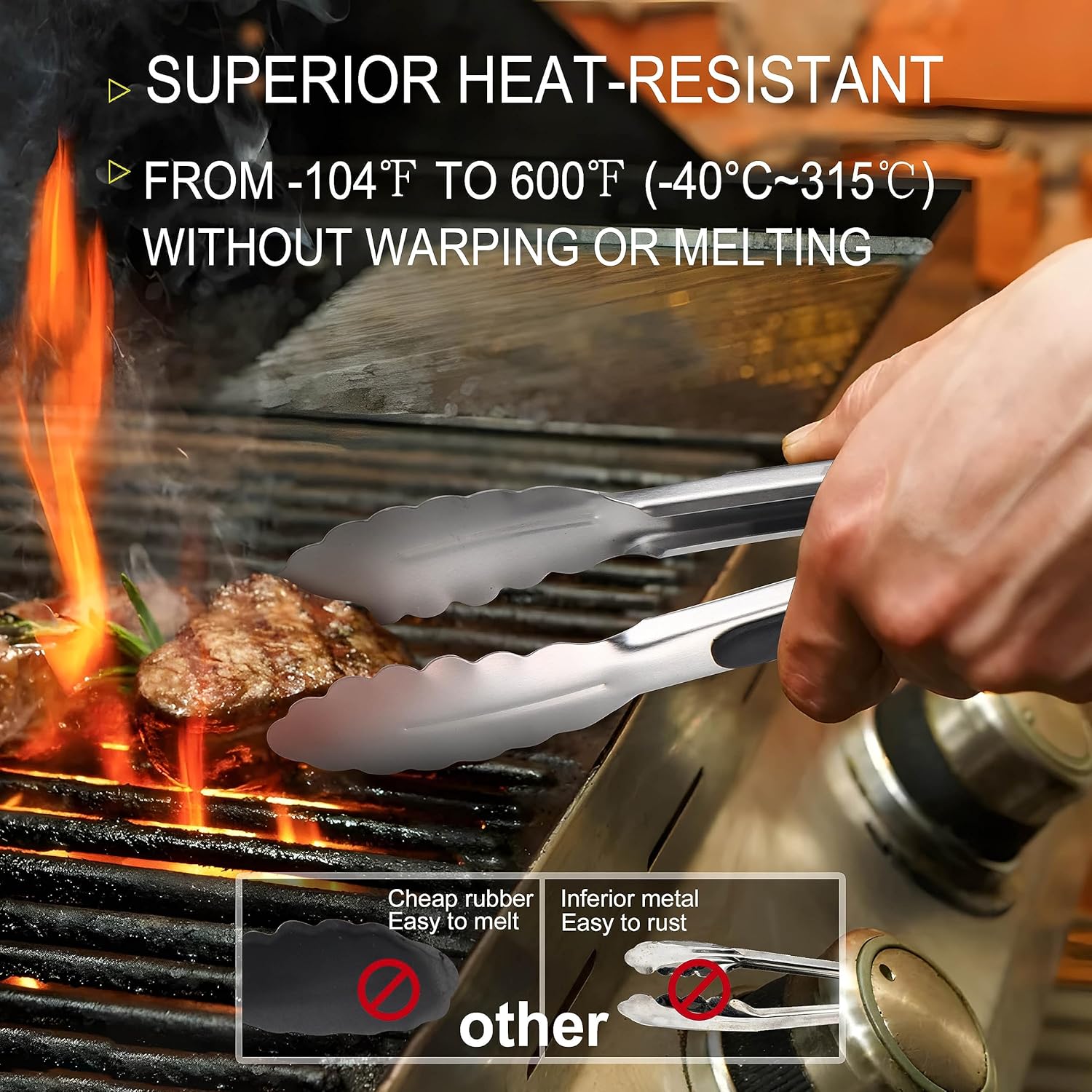 - HEAT RESISTANT UP TO 480F - Made of high quality thicken stainless steel, making these metal tongs durable and resistant to corrosion and rust. Easy to clean and Dishwasher Safe. Just pop these handy stainless steel tongs in your washer for easy clean-up.