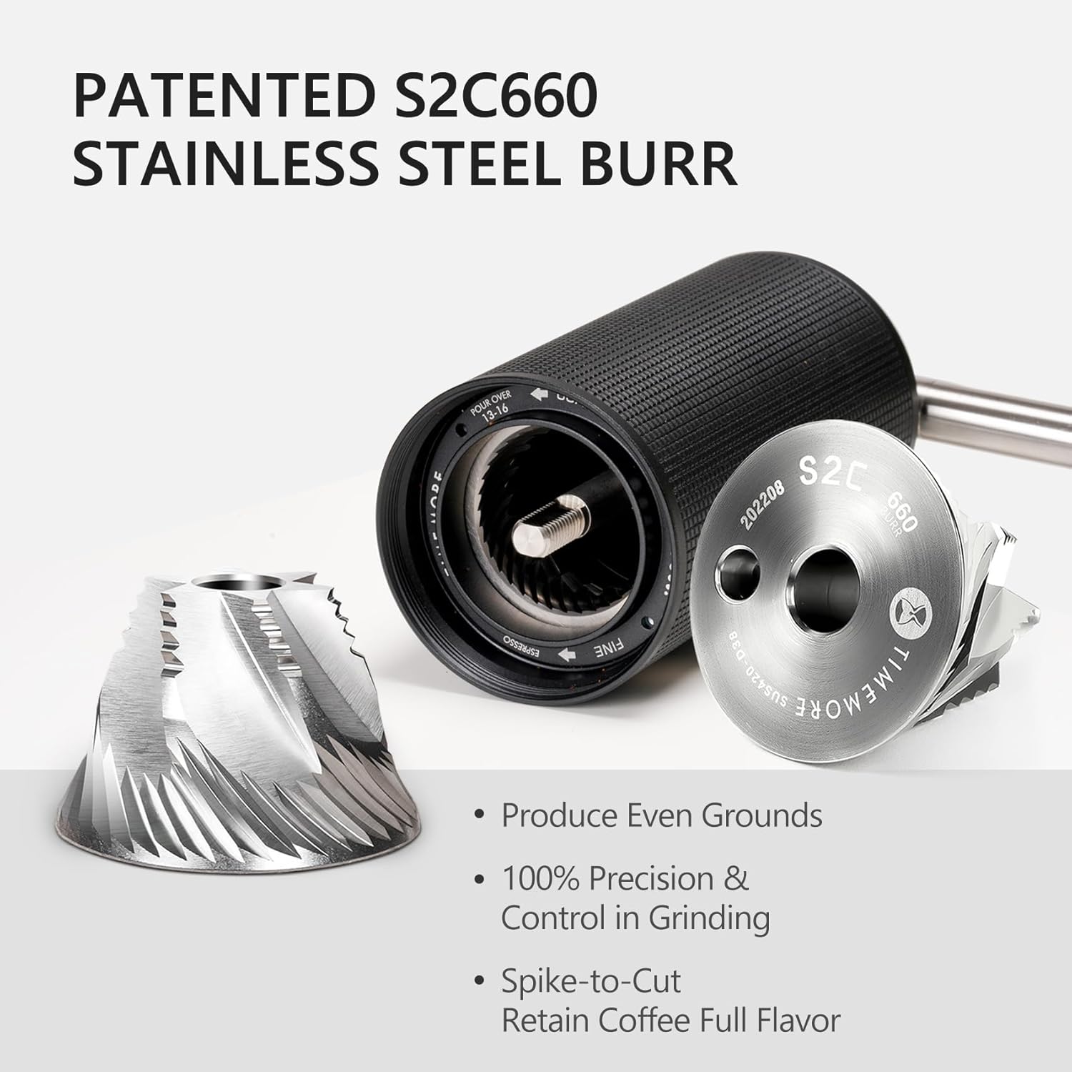- [ S2C Patent Hexagonal Conical Grinding Burr ] The TIMEMORE Manual Coffee Grinder is equipped with the revolutionary S2C660 patent conical burr. Hand Coffee Grinder Milling blade with 55-58HRC hardness in 5-axis CNC machining realizes uniform grinding with almost no excessively coarse grains. At the same time, the generation of fine powder is minimized. This advanced burr design ensures a consistent and even grind size, allowing for the perfect extraction of flavor from every bean