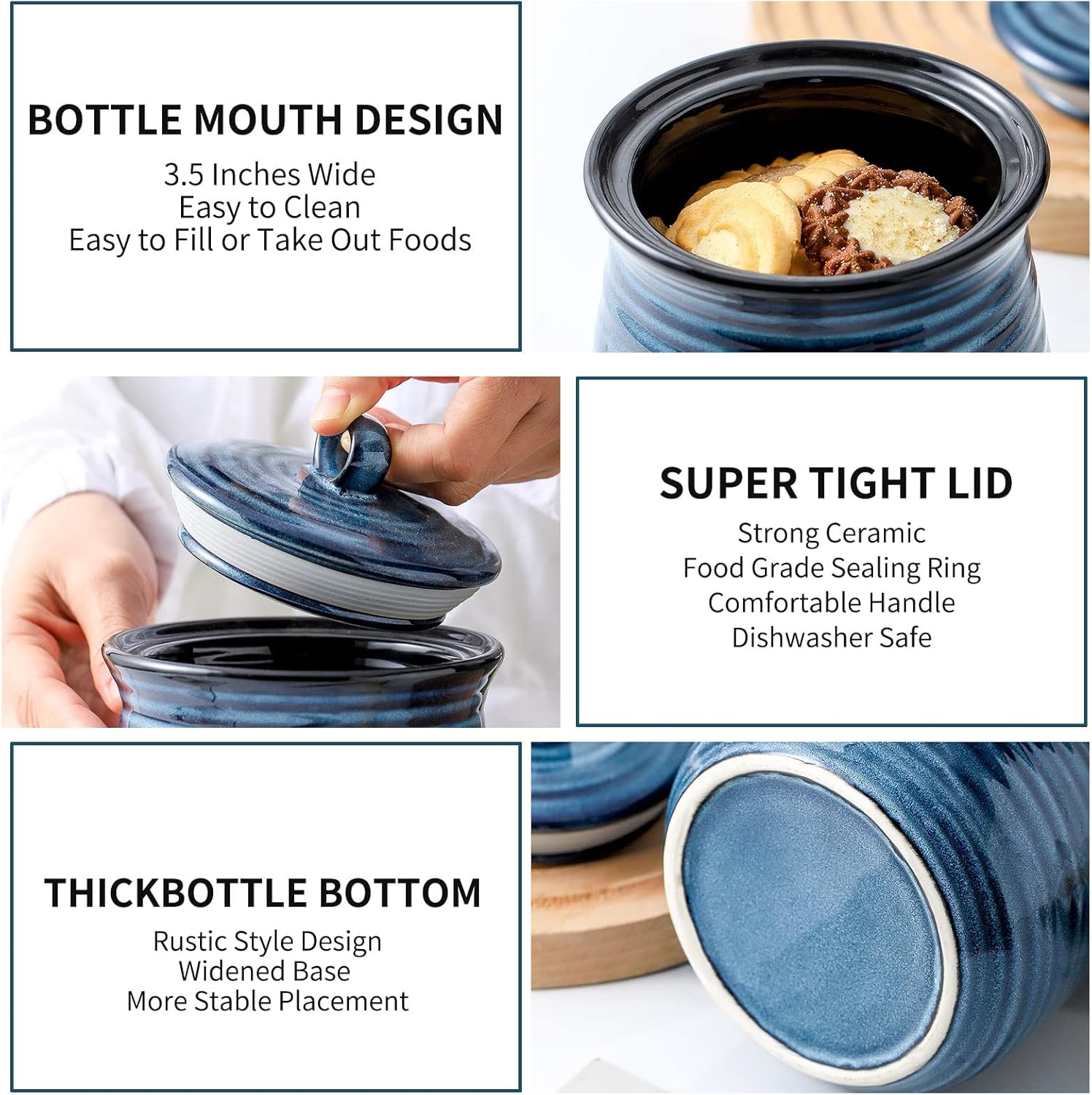 - Extended Freshness Guarantee: Bid farewell to lid mishaps and embrace prolonged food freshness. Witness our ceramic lid enhancement, featuring an improved seal. Every jar comes furnished with an airtight sealing ring and a user-friendly handle. This duo forms an enclosed haven, expertly thwarting air and moisture infiltration. Your stored treasures' quality and flavors remain intact, an assurance of enduring freshness.