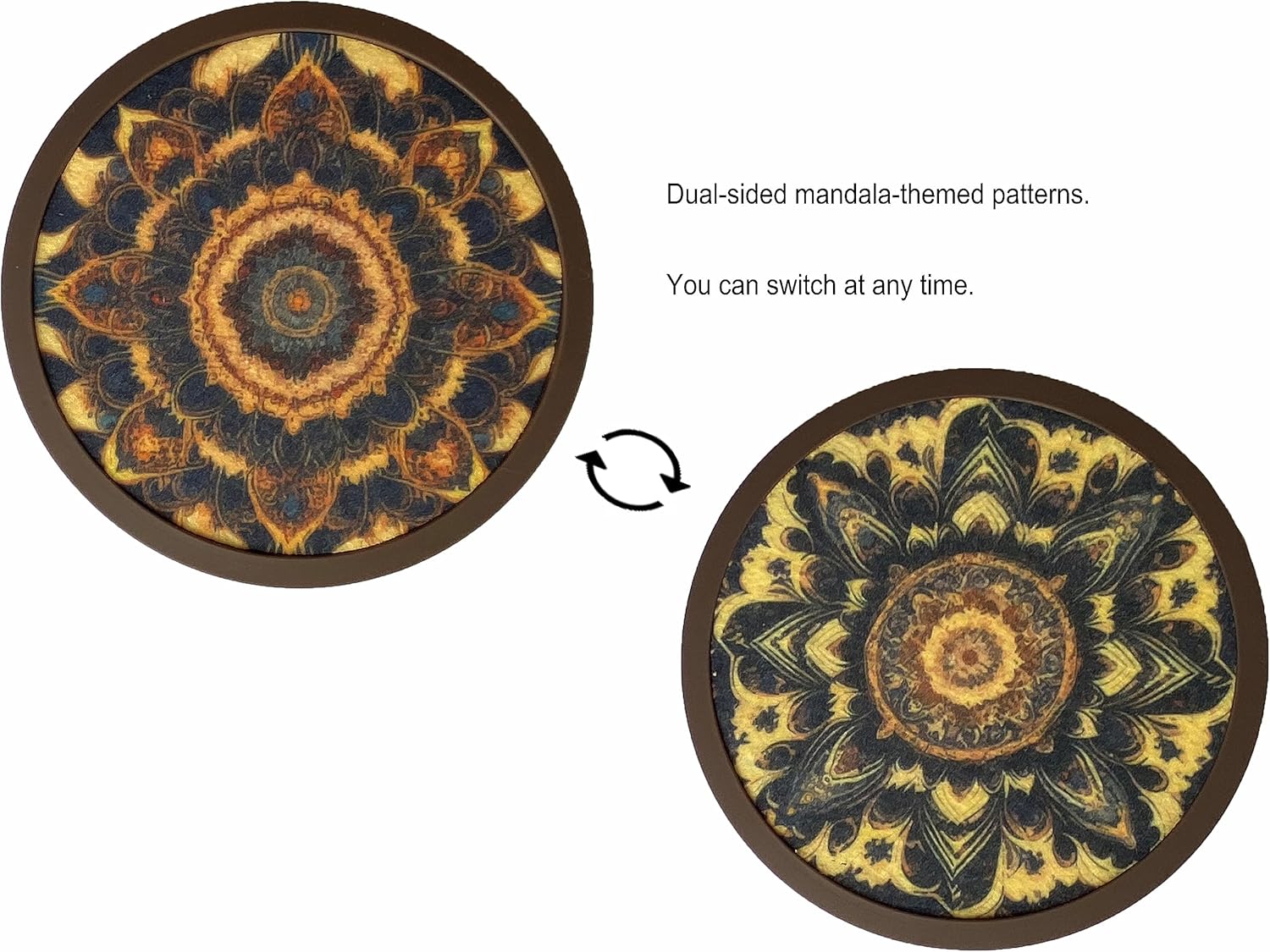 Absorbent Coasters for Drinks with Holder - 6packs, Silicone Coaster with Soft Felt Insert (4.3 inch Coasters with 4.5 inch Holder, Dual-Sided Mandala -Themed Patterns)