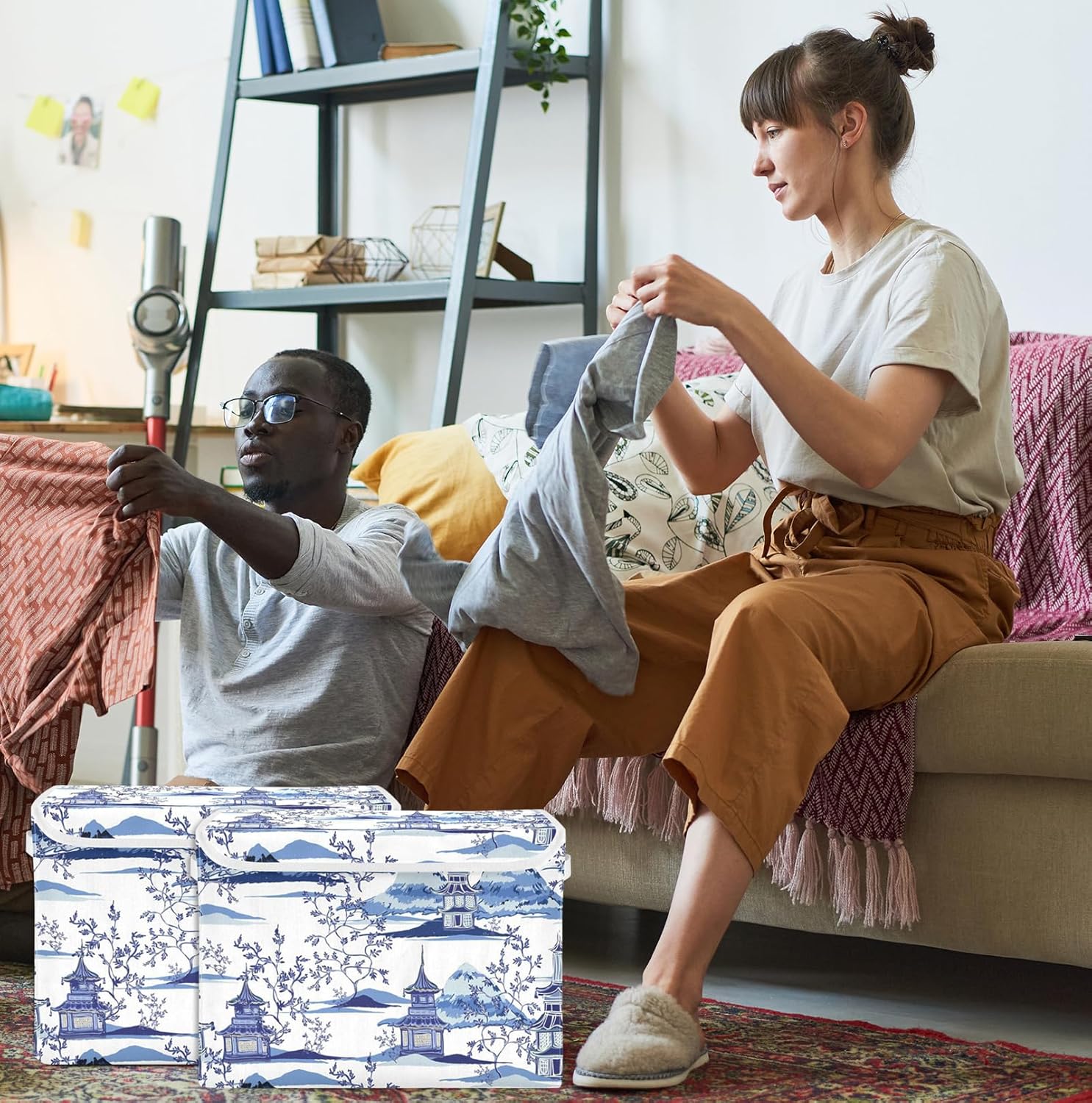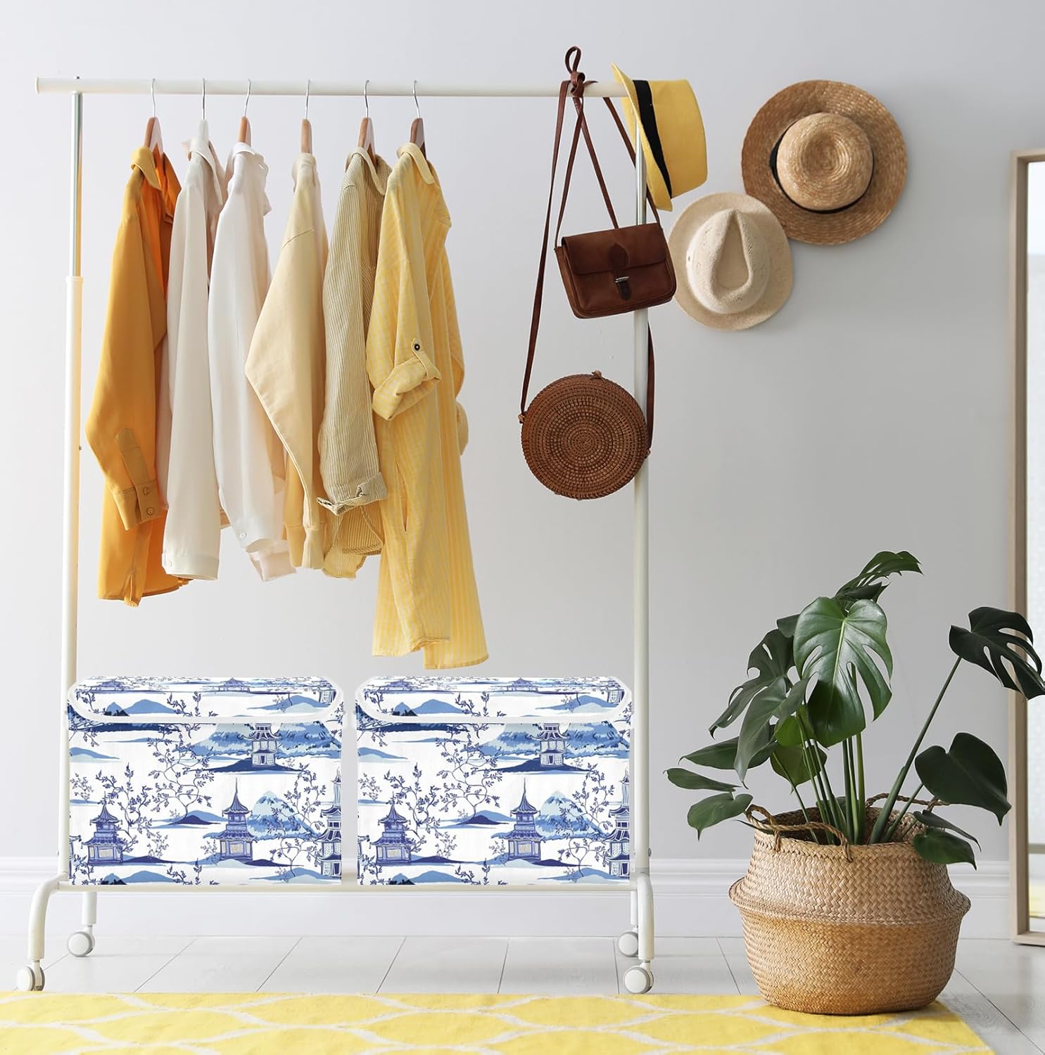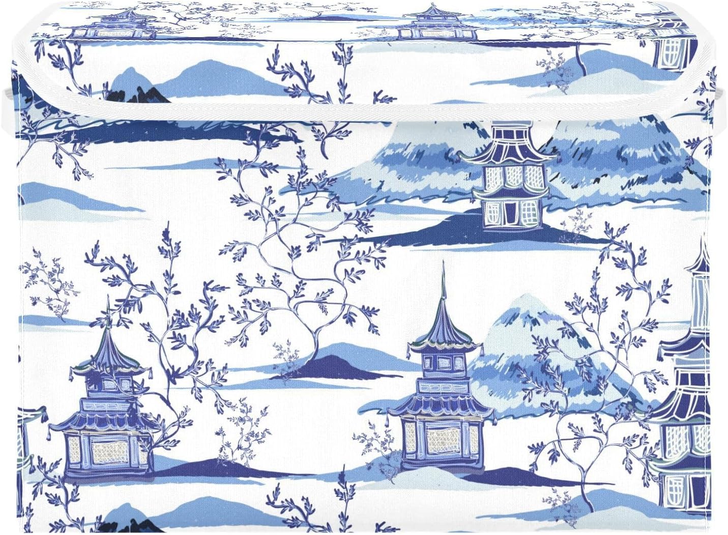 susiyo Ink Chinoiserie Pagodas Storage Bin Large Collapsible Storage Box Stackable design Fabric Storage Bins with Lids Decorative Multi-Color Foldable Organizing Baskets For Closet