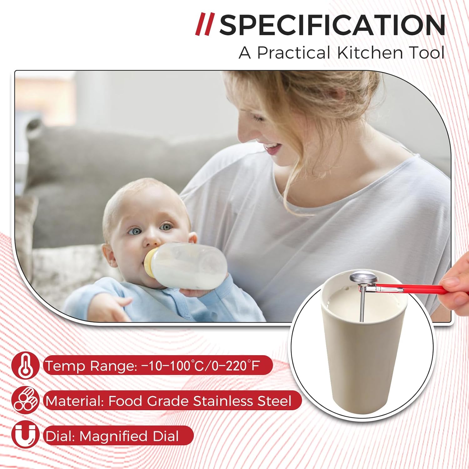 - [QUALITY MATERIAL]: This immediate read pocket food thermometer is made of 304 food grade stainless steel, featuring in ultra rust resistance, durability and safety. These sleeves of thermometers is made of plastic and metal, featuring in portability. These stainless steel kitchen thermometer and sleeves are well-tested by the manufacturer to support a longer service life. The number in the dial is clear to read, and the needle in the dial helps you to measure temperature for milk coffee