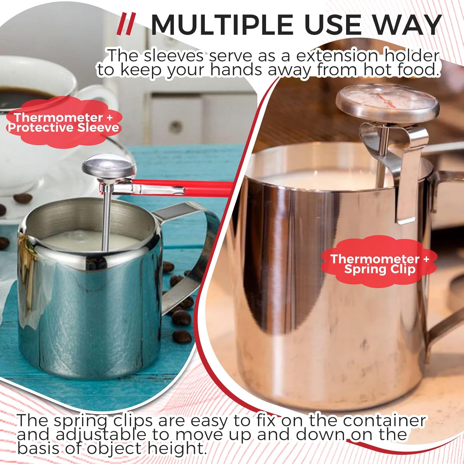 - [MORE SAFETY]: This stainless steel dial food thermometer comes with 6 pcs red plastic sleeves and 6 pcs spring clips. The protective sleeves have a small hole at the top, where thermometer probe can go through. The sleeves serve as a extension holder to keep your hands away from hot food. The spring clips is easy to fix on the container and adjustable to move up and down on the basis of object height