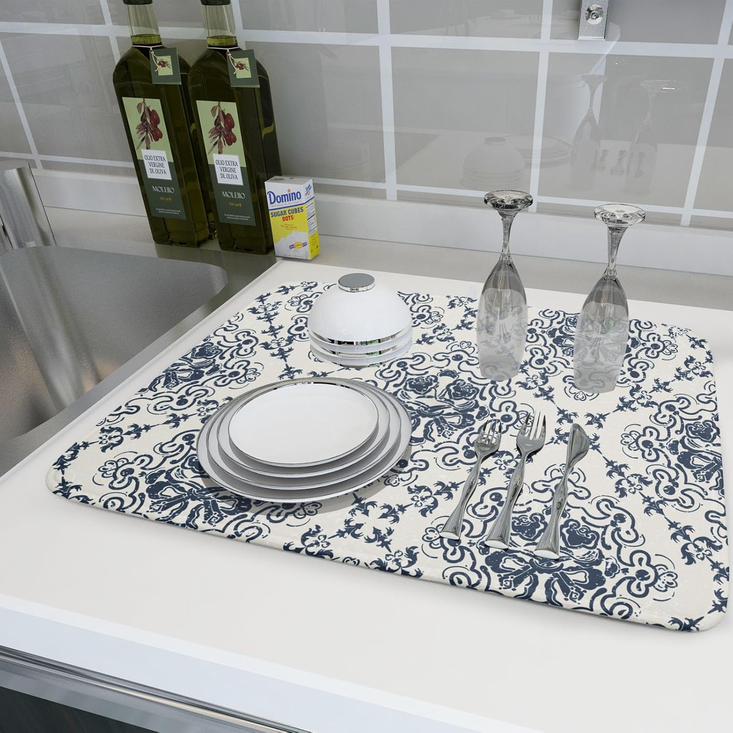 - 3【Unique Design】: Bohemian style dish drying mats with vibrant bright boho flower pattern, which can add more charming charm to your kitchen office or coffee bar counter. The drying mat for kitchen counter with unique hanging rope design that can be hung without occupying any space,soft and foldable, easy to store.
