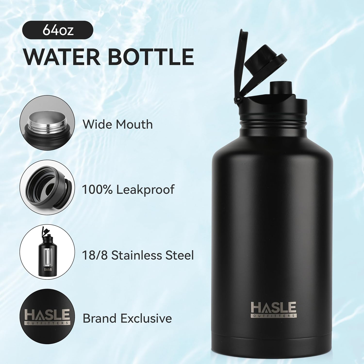 HASLE OUTFITTERS Half Gallon Insulated Water Bottles 64 oz, Stainless Steel Metal Water Jug with 2 Lids Keep Cold 48h/Hot 24h, Leak Proof & BPA-Free Water Flask Jug(Black,1)