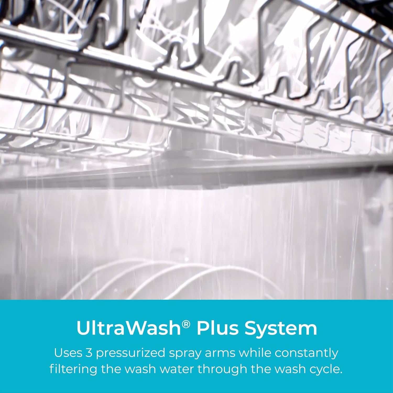 - UltraWash Plus Power Cleaning: 3 pressurized spray arms clean dishes from every angle using fresh, filtered water. Accela Wash option cleans dishes if you're in a hurry. Sani Rinse option gets dishes seriously clean and sanitized
