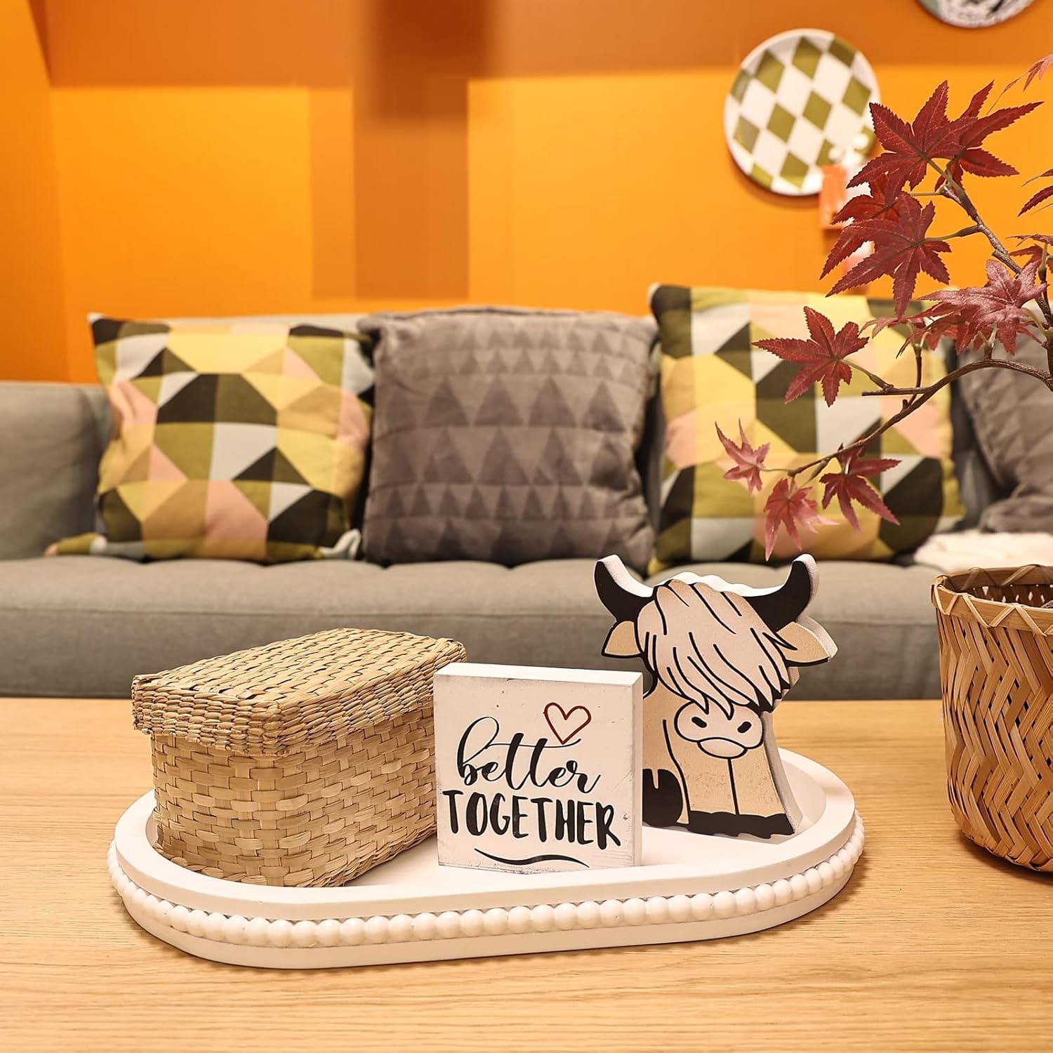 Oval Wood Serving Tray with Wooden Beads, Outdoor Farmhouse Decorative Tray for Ottoman, Coffee Table, Kitchen Counter Organizer, Home Decor(White)