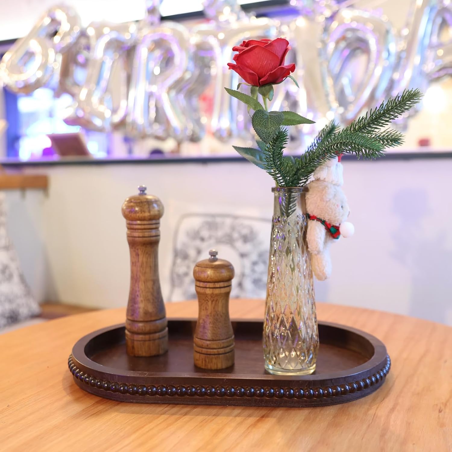 Oval Wood Decorative Tray with Wooden Beads, Vintage Serving Platter Tray for Ottoman, Coffee Table, Entertaining, Kitchen Counter Organizer, Home Decor (Retro Brown)