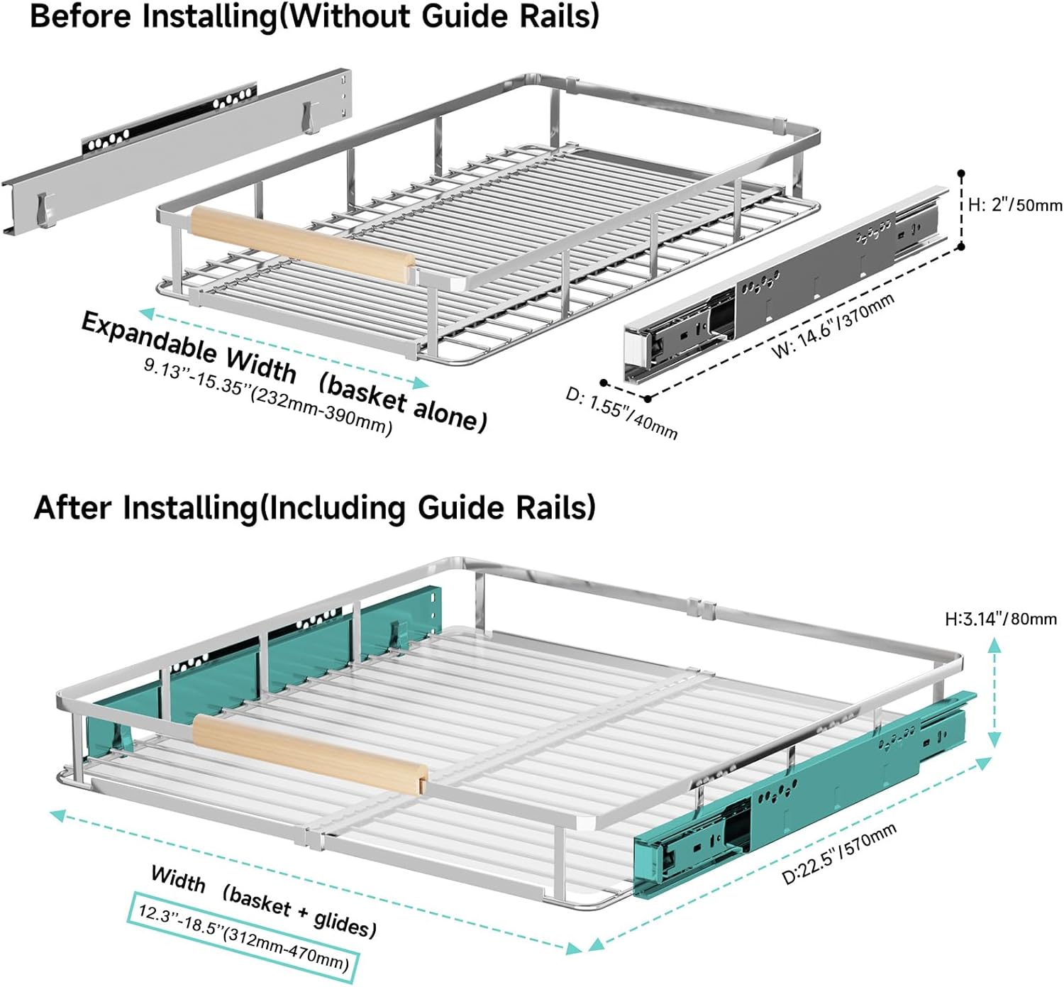 - Expandable Width: This jkxoo Expandable pull out cabinet shelf is designed to fit in most cabinets. The width of the heavy duty slide out storage shelf can be adjusted from 12.3’’ to 18.5’’ and 22.5" in depth. The new expandable design gives you a better experience and saves your space. It can better utilize and save more cabinet space than ordinary pull out cabinet organizers.