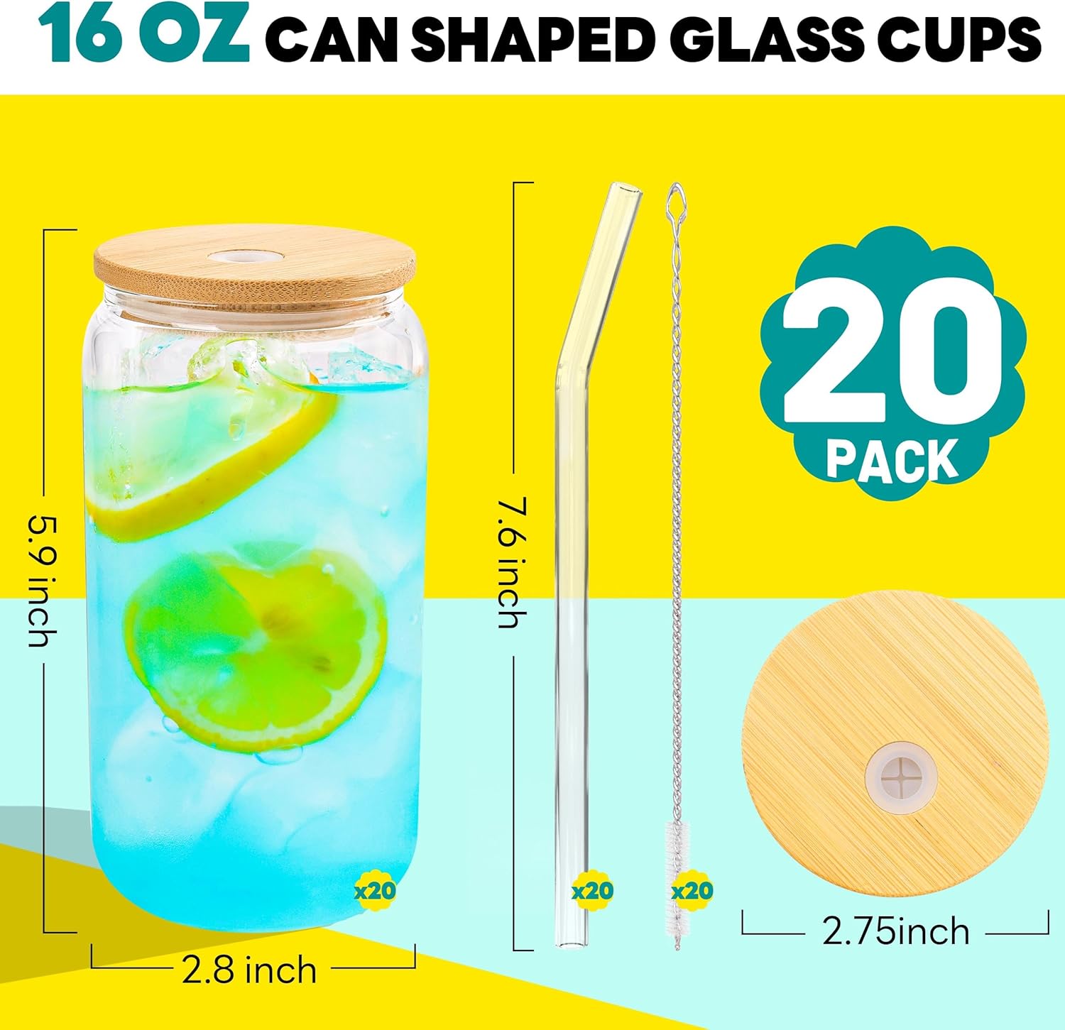 Joyclub Glass Cups with Bamboo Lids and Straws 20 Set 16 oz Reusable Iced Coffee Cup Beer Can Drinking Jars for Smoothie Whiskey Boba Soda Tea Gift
