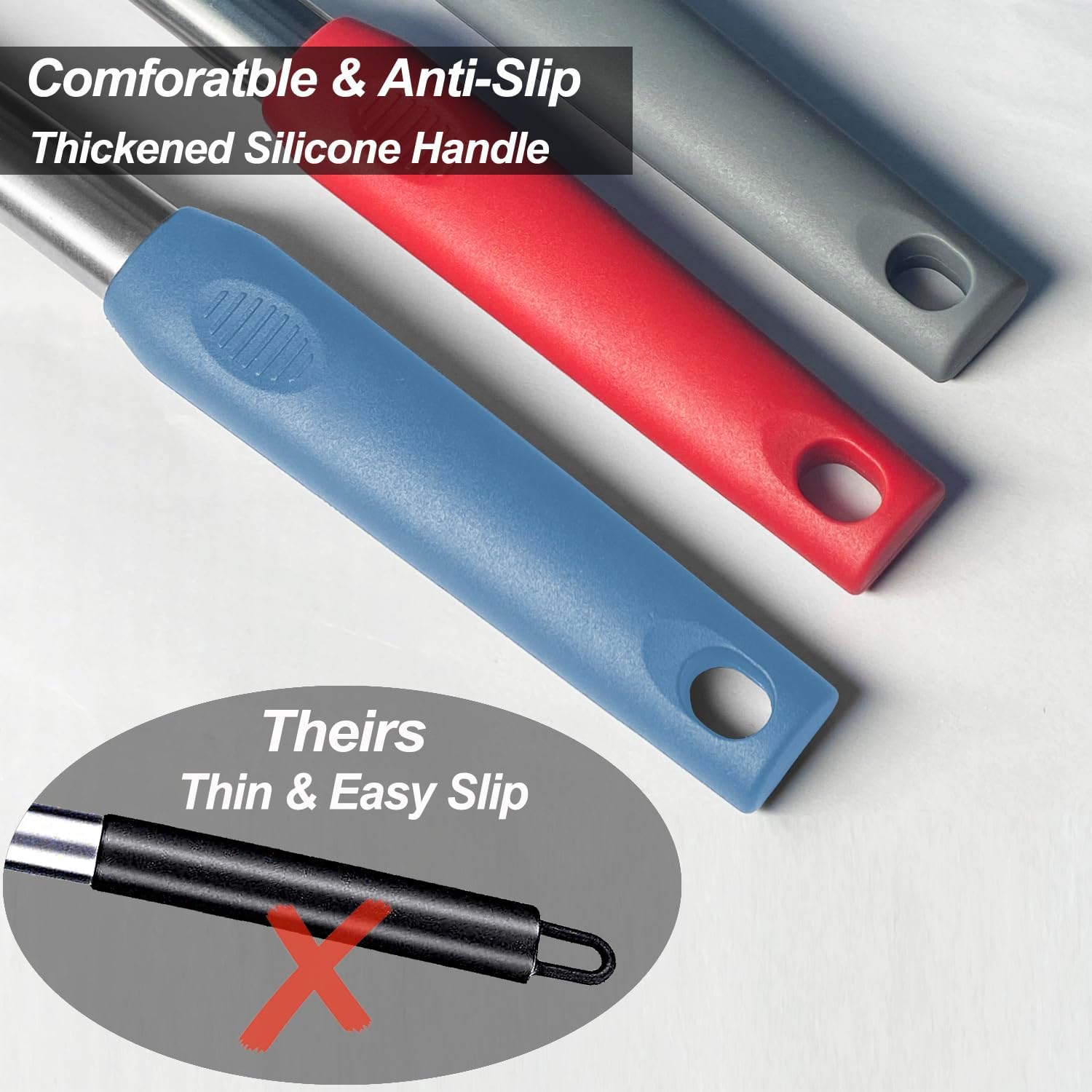 - More Comfortable Handle: Unlike other generics, we upgrade the handles; The stainless steel handle core is coated with thicker silicone, it is more durable, and isolate heat better; The profile is ergomonic designed and gives your better grip experience.