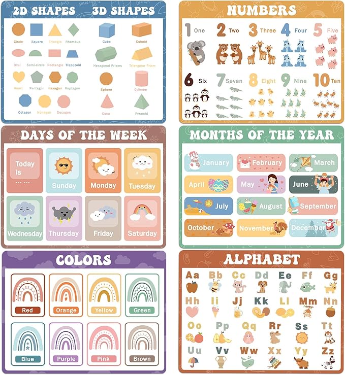Educational Preschool Placemats for Kids Set of 6 Boho Toddler Plastic Placemat Reusable Washable Children Montessori Eat Table Mat for Homeschool Nursery Kindergarten Classroom Dining Table
