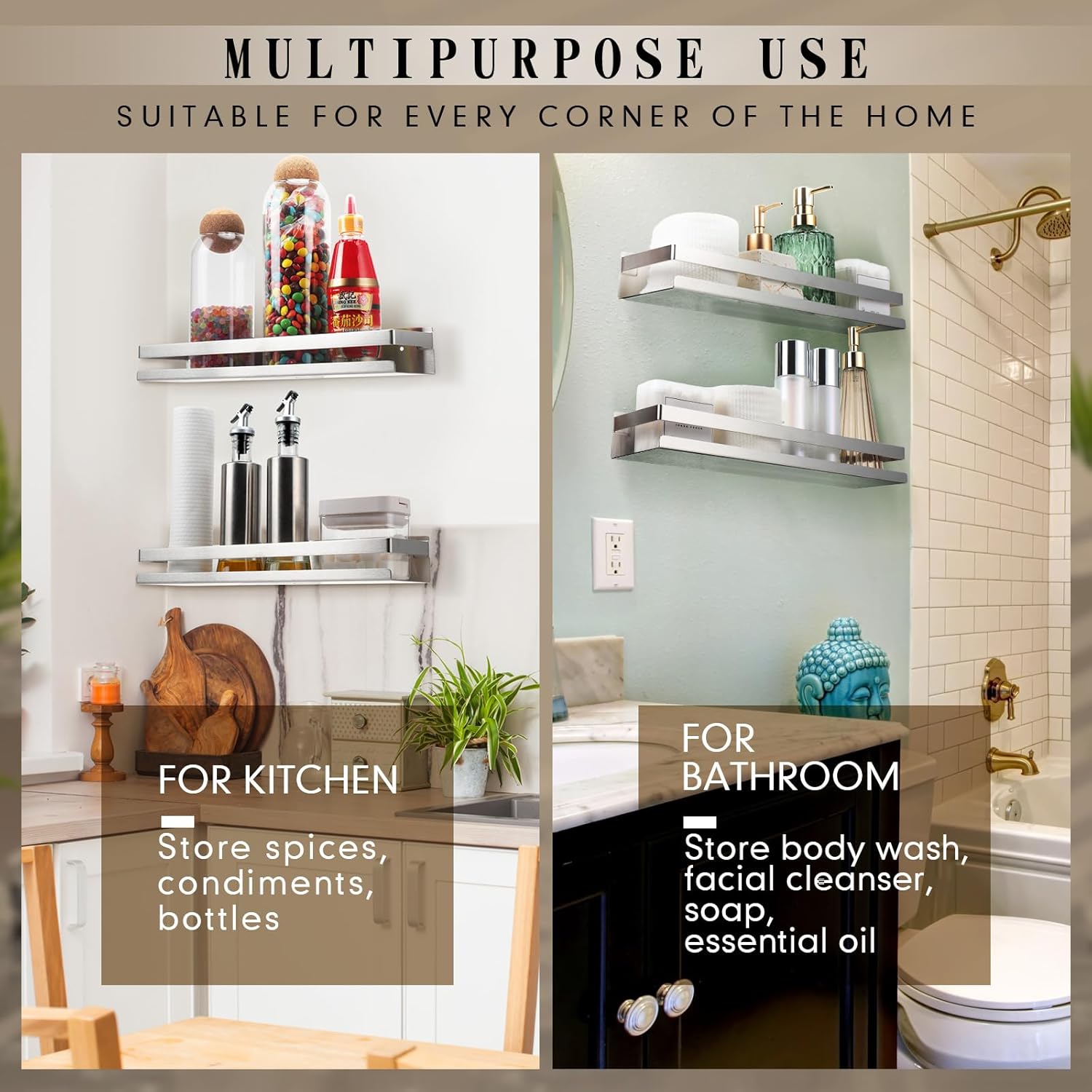 - Wide Usages: stainless steel wall shelf is widely applied for bathroom, toilet, kitchen, bedroom, to store shampoo, shower gel, facial cleanser, essential oil, seasoning bottles, bottles, and so on, to keep your items in place and in order, easy to find when you need to use