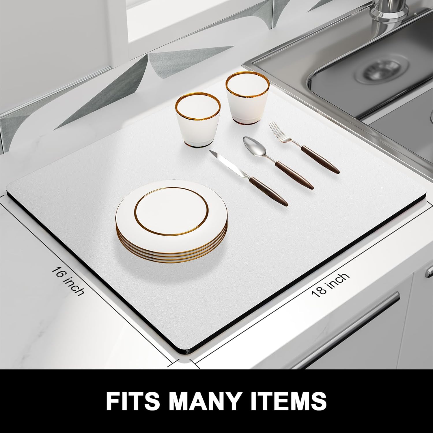 - Protect Tableware: Kitchen drying mats measure 16 x 18 inch. Fit most kitchen countertop space. 0.12 inch thick to protects your counter from scuffs and scratches while also keeping your most prized glassware safe and sound