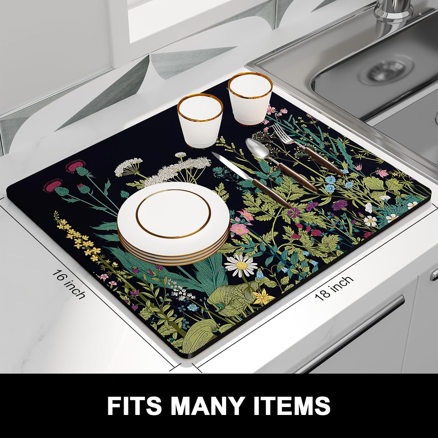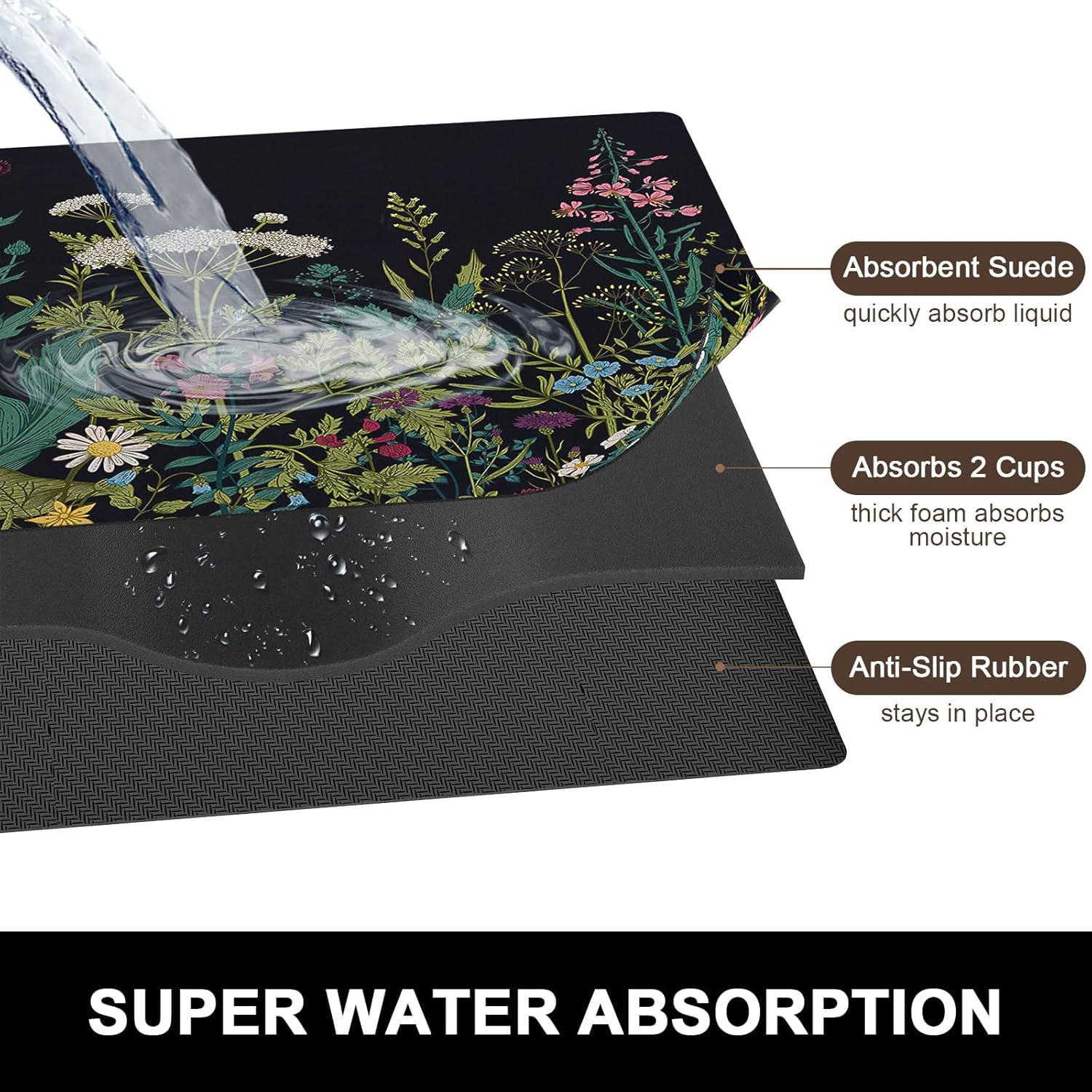 Rnivvi Dish Drying Mat for Kitchen Counter, 16 x 18" Cute Flower Theme Absorbent Heat Resistant Drying Pad with Non-slip Rubber, Coffee Bar Mats for Dish Rack Kitchen Decor Accessories, Black