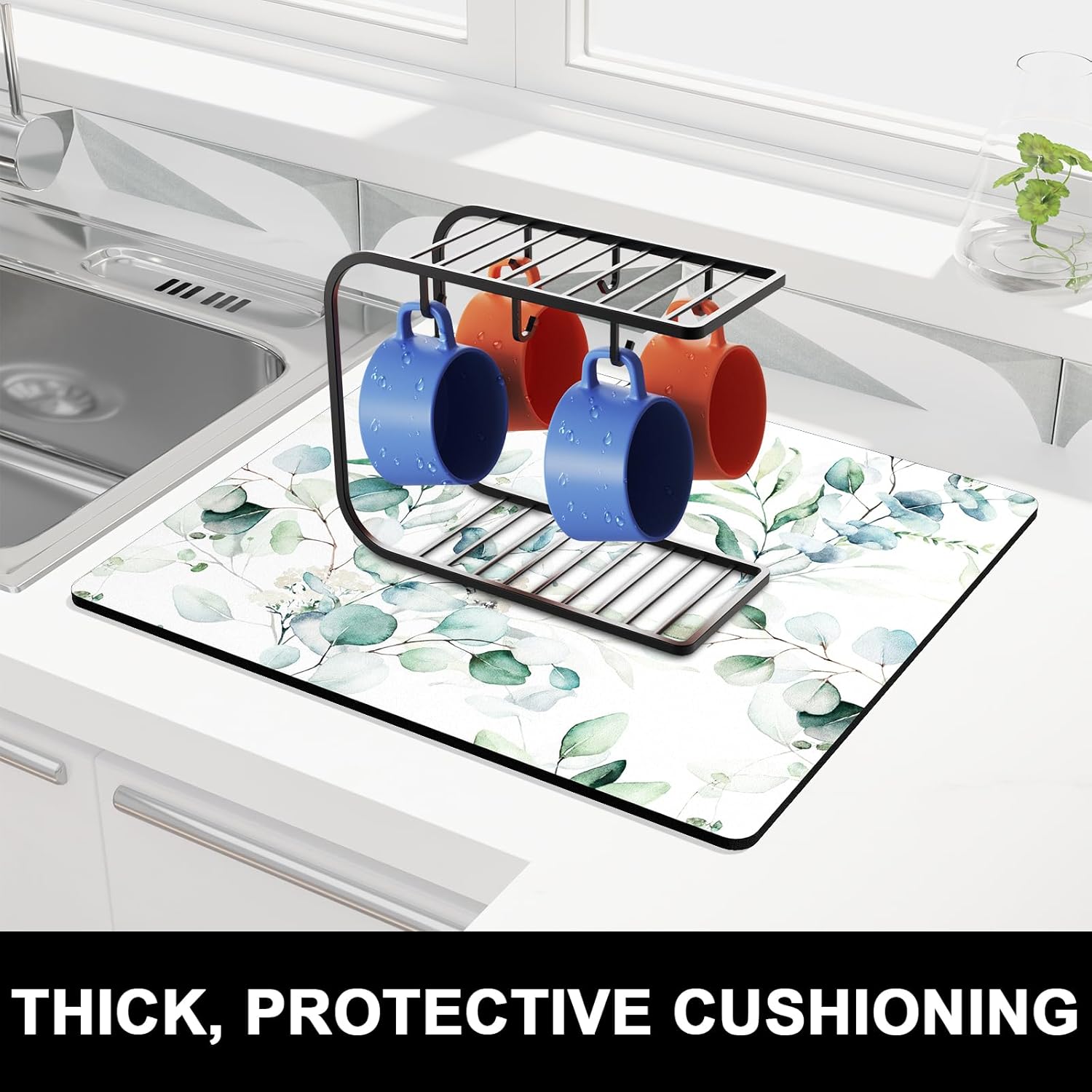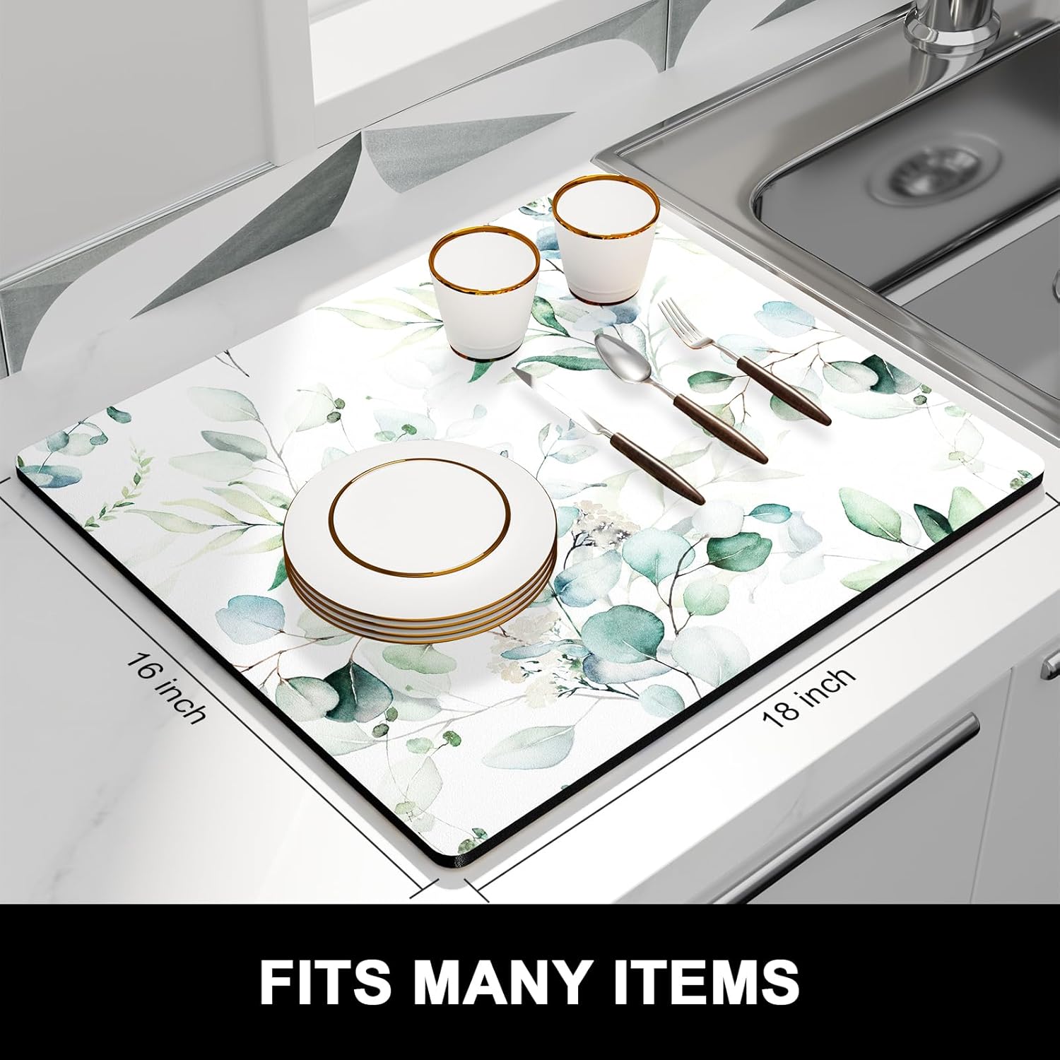 - Protect Tableware: Kitchen drying mats measure 16 x 18 inch. Fit most kitchen countertop space. 0.12 inch thick to protects your counter from scuffs and scratches while also keeping your most prized glassware safe and sound