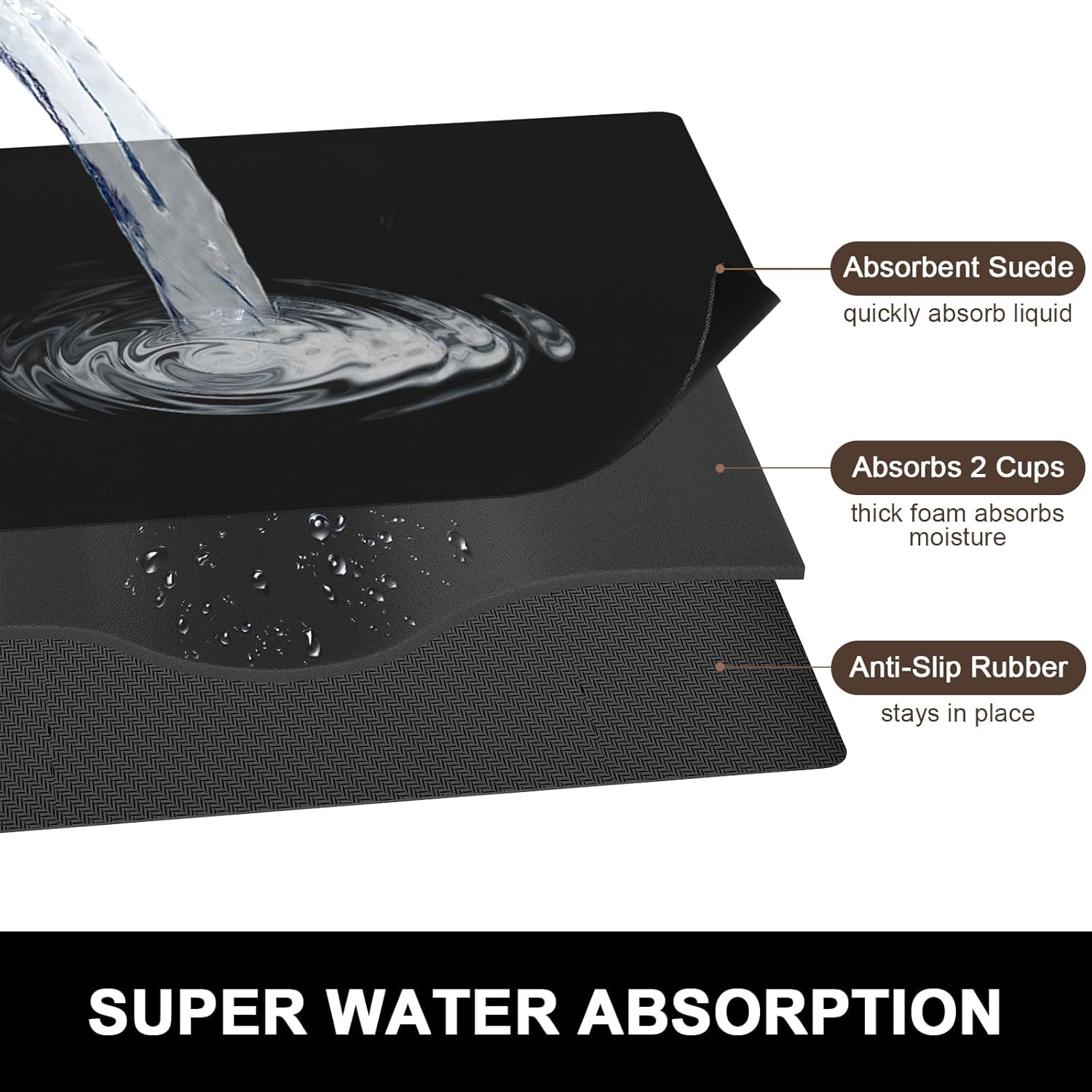 Rnivvi Dish Drying Mat, 16x18" Absorbent Drying Mat for Kitchen Counter, Cute Heat Resistant Dish Drying Pad Anti-Slip Dish Mat Drying Kitchen Mat, Dish Rack Mats for Bar Counter, Jet Black