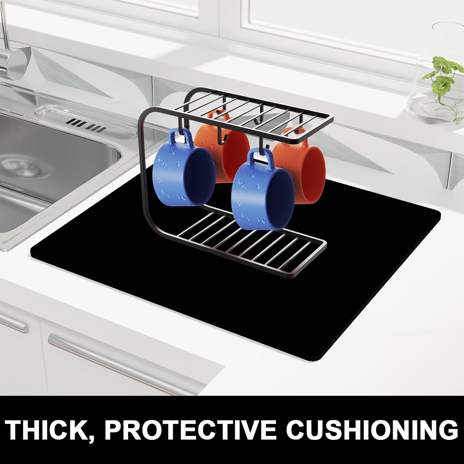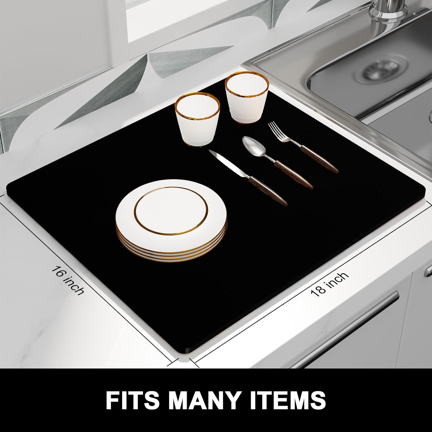 - 【Protect Tableware】Kitchen drying mats measure 16 x 18 inch. Fit most kitchen countertop space. 0.12 inch thick to protects your counter from scuffs and scratches while also keeping your most prized glassware safe and sound. The rubber backing with anti-slip texture adds stability when drying stemware or other delicate items, helping to keep the mat securely in place and prevents it from sliding around.