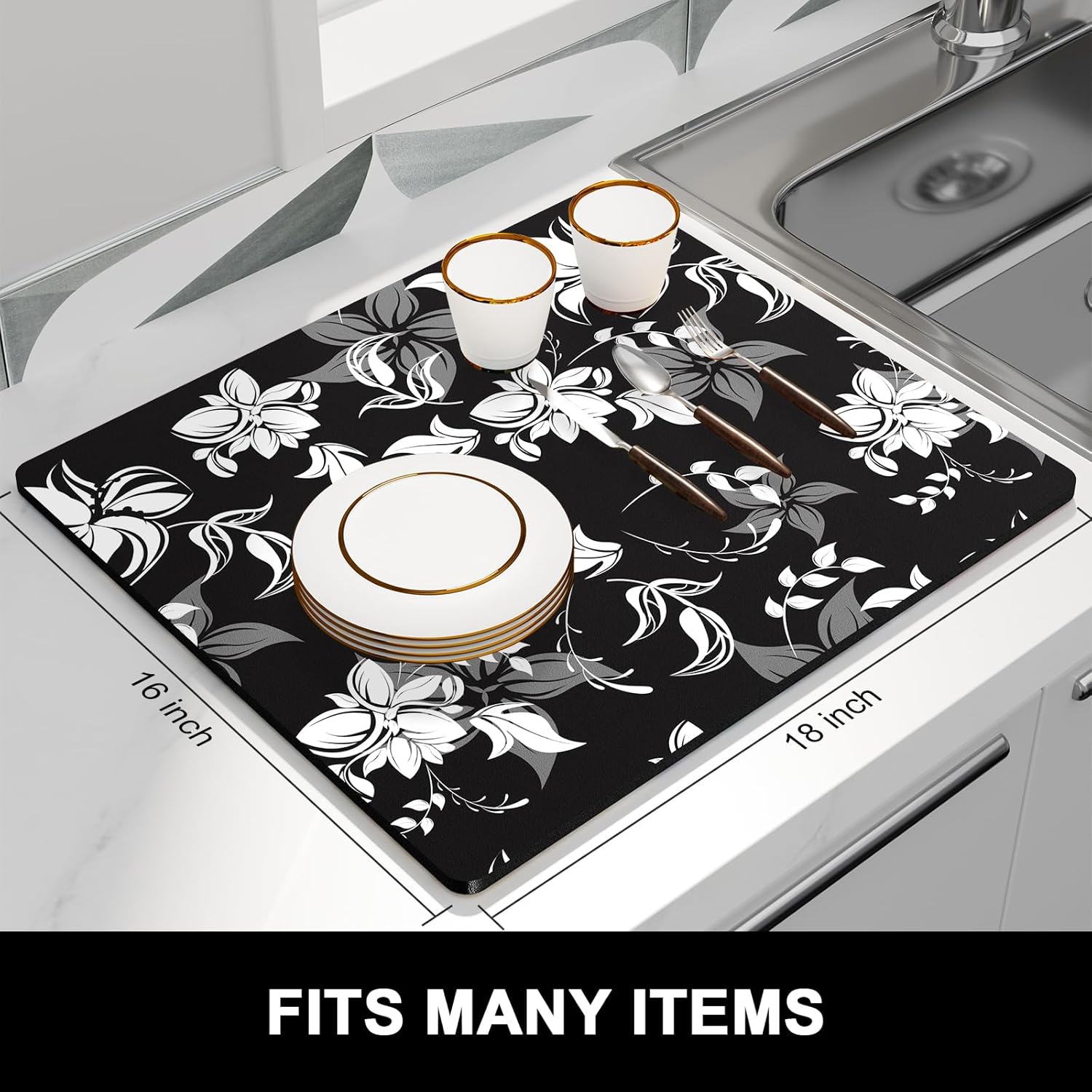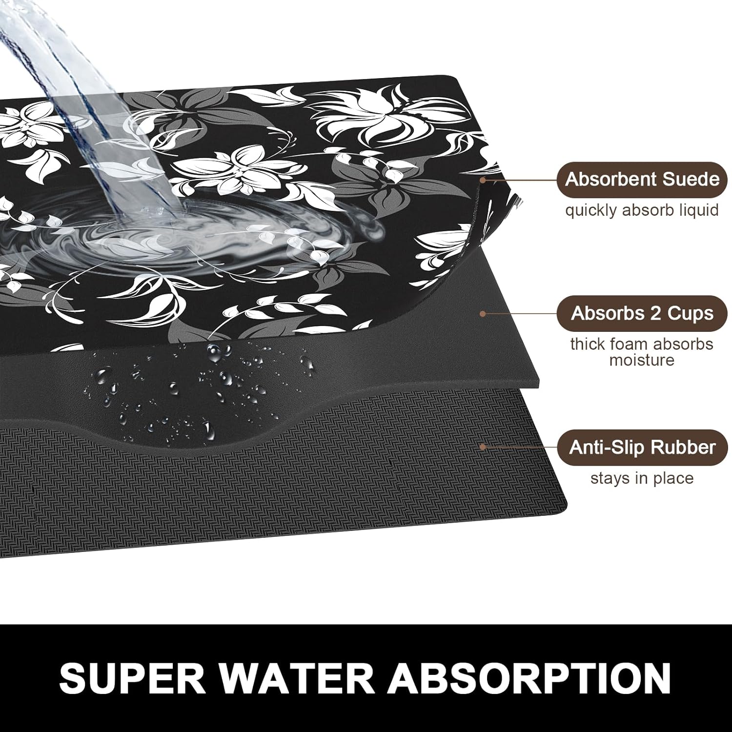 Rnivvi Dish Drying Mat for Kitchen Counter, 16 x 18" Cute Flower Theme Absorbent Heat Resistant Drying Pad with Non-slip Rubber, Coffee Bar Mats for Dish Rack Kitchen Accessories, Black White
