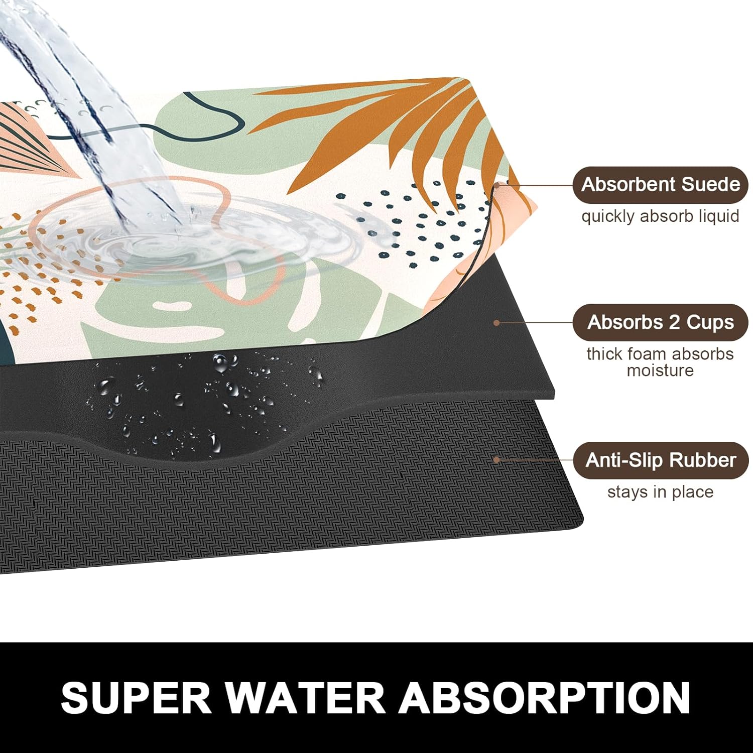 Rnivvi Dish Drying Mat for Kitchen Counter, 16 x 18" Cute Boho Theme Absorbent Heat Resistant Drying Pad with Non-slip Rubber, Coffee Bar Mats for Coffee Machine Dish Rack, Tropical Leaves