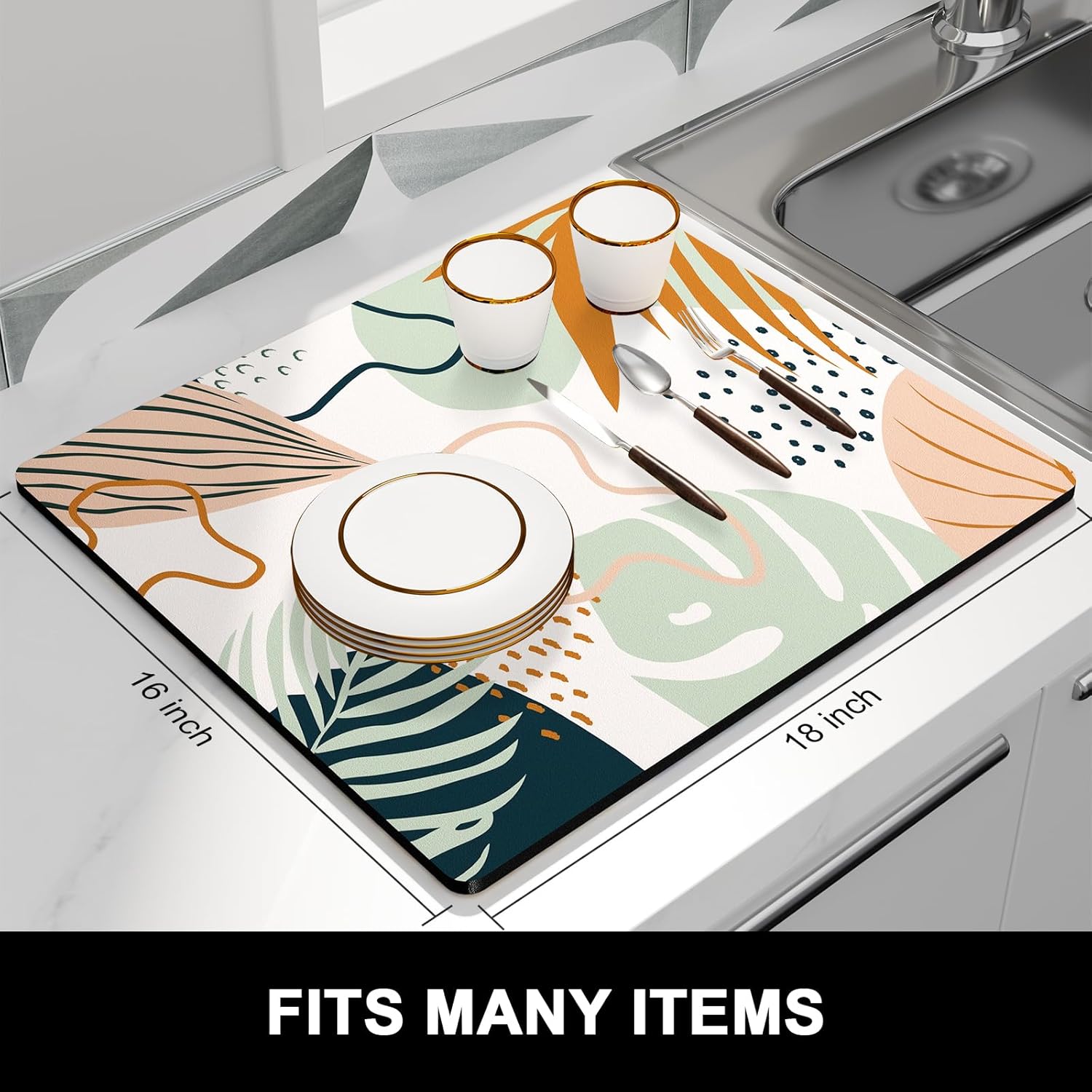 - Protect Tableware: Kitchen drying mats measure 16 x 18 inch. Fit most kitchen countertop space. 0.12 inch thick to protects your counter from scuffs and scratches while also keeping your most prized glassware safe and sound
