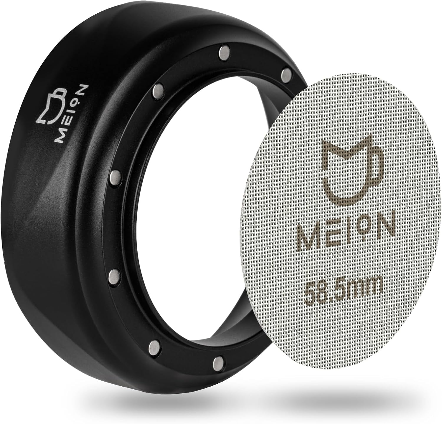 MEION 58mm Espresso Dosing Funnel and 58.5mm Puck Screen Set for 58mm Portafilters, Magnetic Coffee Portafilter Funnel, Reusable Espresso Puck Screen, Espresso Tools Espresso Accessories (58mm, Black)