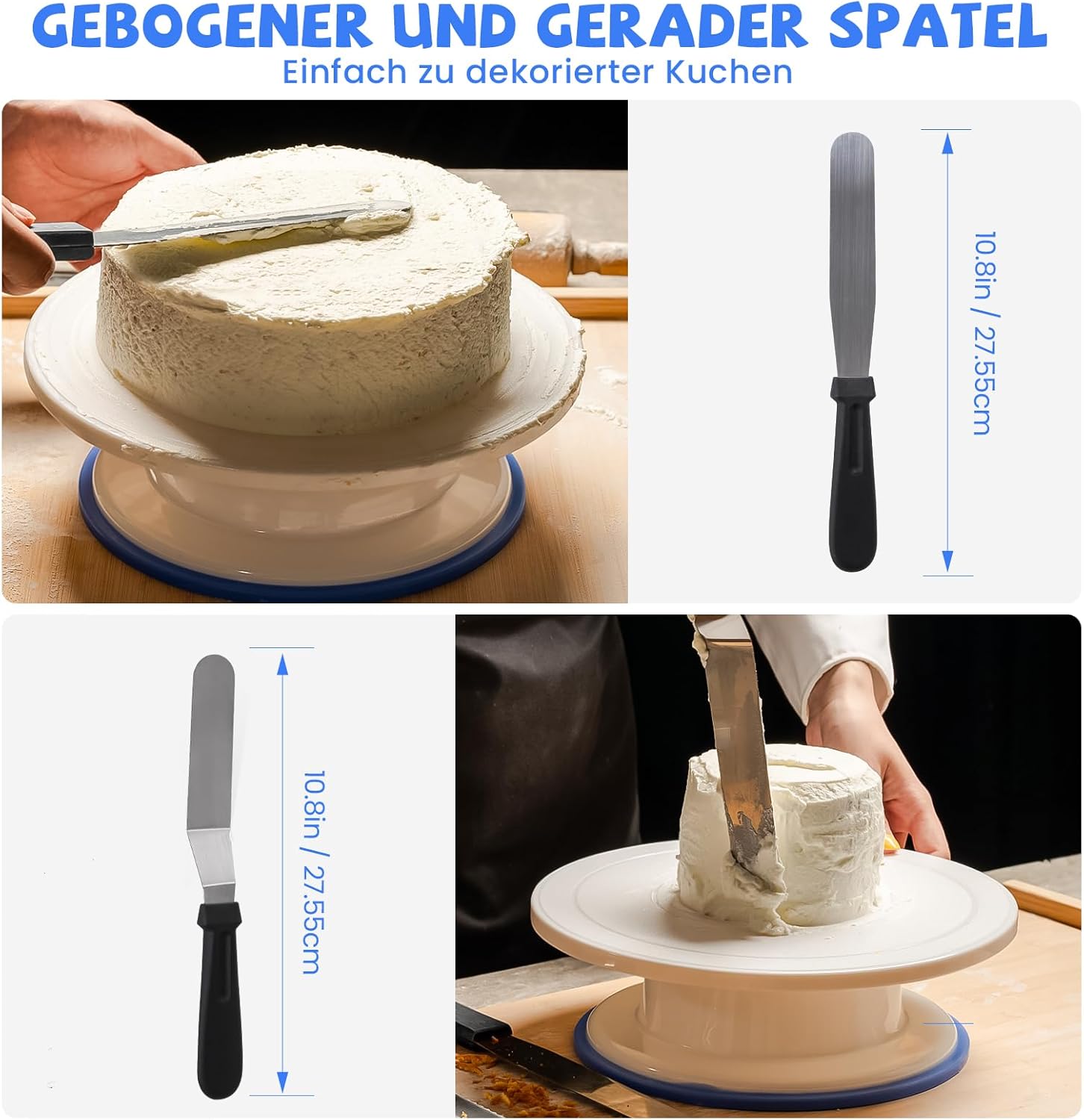 - 【All Essential Cake Decorating Tools】When rotating cake decorating, use the 11‘’ straight & offset spatula to easily apply frosting to cakes, create layered cakes and cut off excess cake. 3 Icing Smoother Cake Combs to easily smooth and decorate cake frosting on the front and sides. All cake tools are essential cake decorating tools.