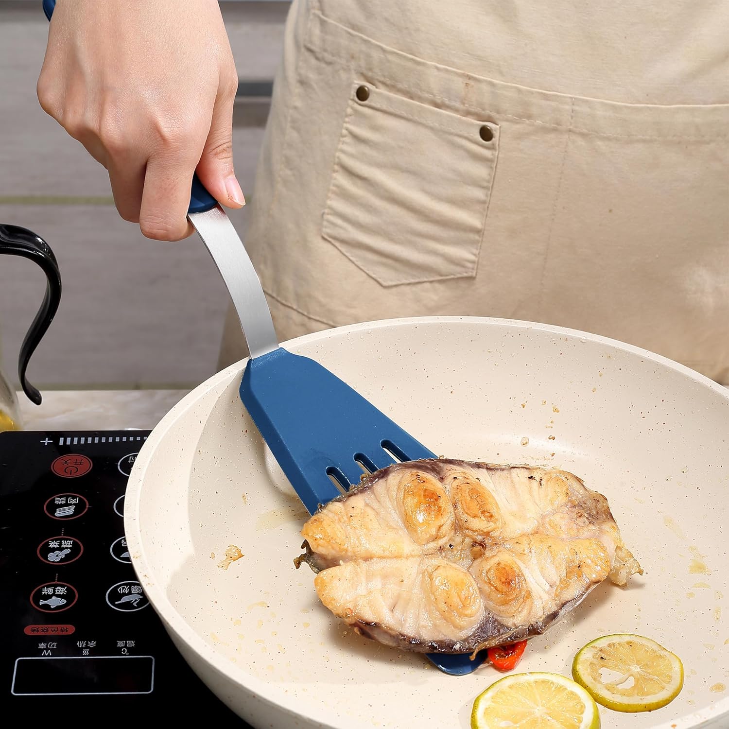 - Meet Various Cooking Needs - this set of products includes 1×angle spatula, 1× silicone fish spatula, 1×large turner spatula, 1×standard turner spatula, 1×silicone solid pancake spatula. They can be used for various cooking purposes and are practical kitchen utensils.