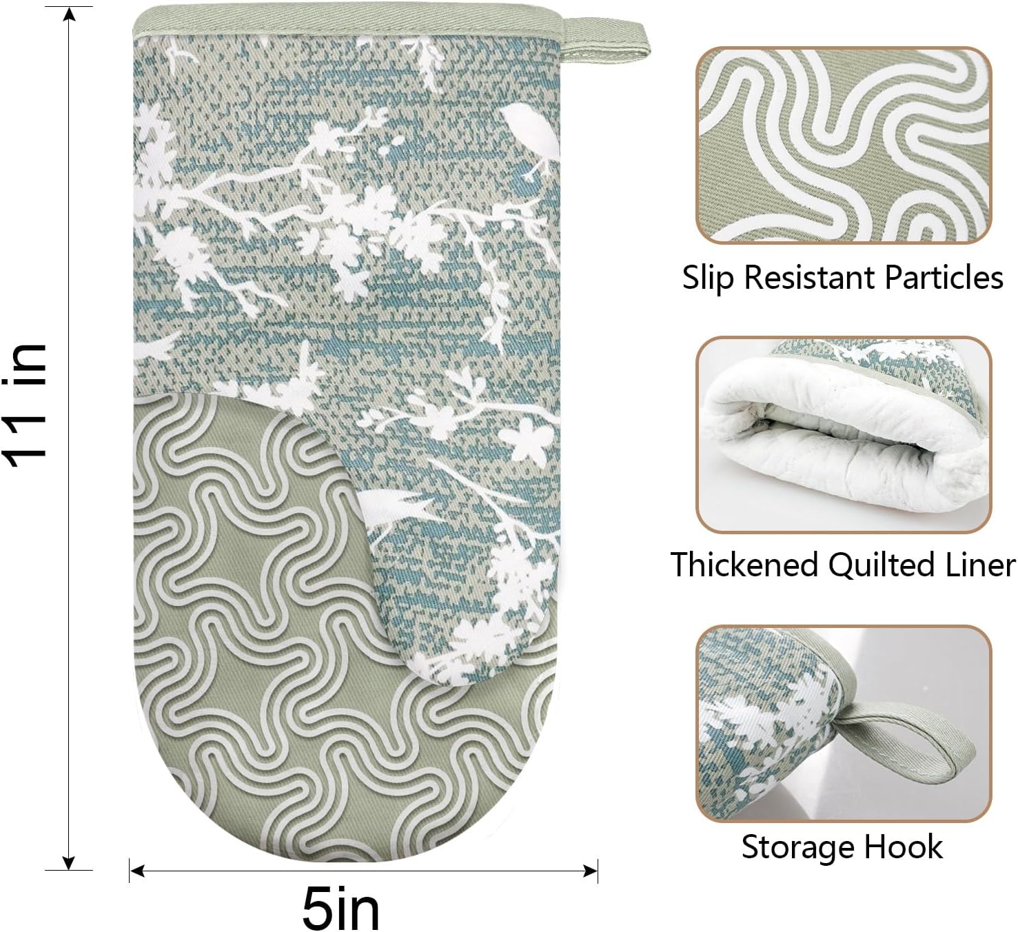 Thumb Oven Mitts, Heat and Slip Resistant Silicone Kitchen Mittens 2-Pack Set, Aqua Birds Soft Long Oven Gloves, Flexible Thick Potholders for Safe Baking Cooking and Grilling (Aqua)