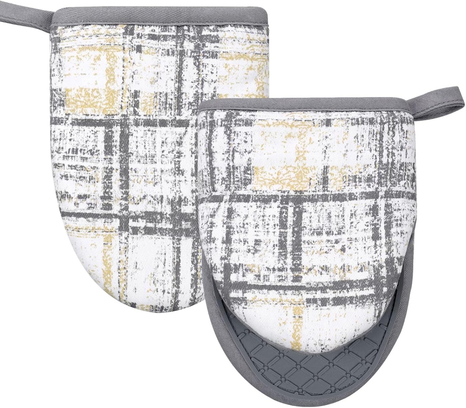 Mini Silicone Oven Mitts, Heat and Slip Resistant Kitchen Gloves 2-Pack Set, Vintage Plaid Soft Oven Mittens, Flexible Pot Holders for Cooking Baking and Grilling (Vintage Grey)
