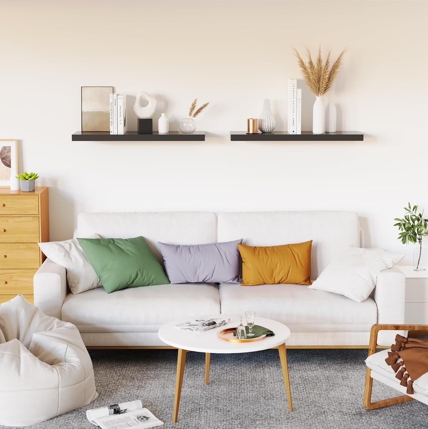 - 【Modern Concise Design】Our black floating shelves are designed with modern simplicity. It has streamlined look to bring modern style and vintage atmosphere to the home. Our wood floating shelves for wall is a set of 2 wall mounted shelves. Our rustic wood shelves can give us plenty of space for creativity, we can choose a line, a ladder shape, or a symmetric way. Let our floating shelf wood more suitable to the home decor and bring a better visual experience.