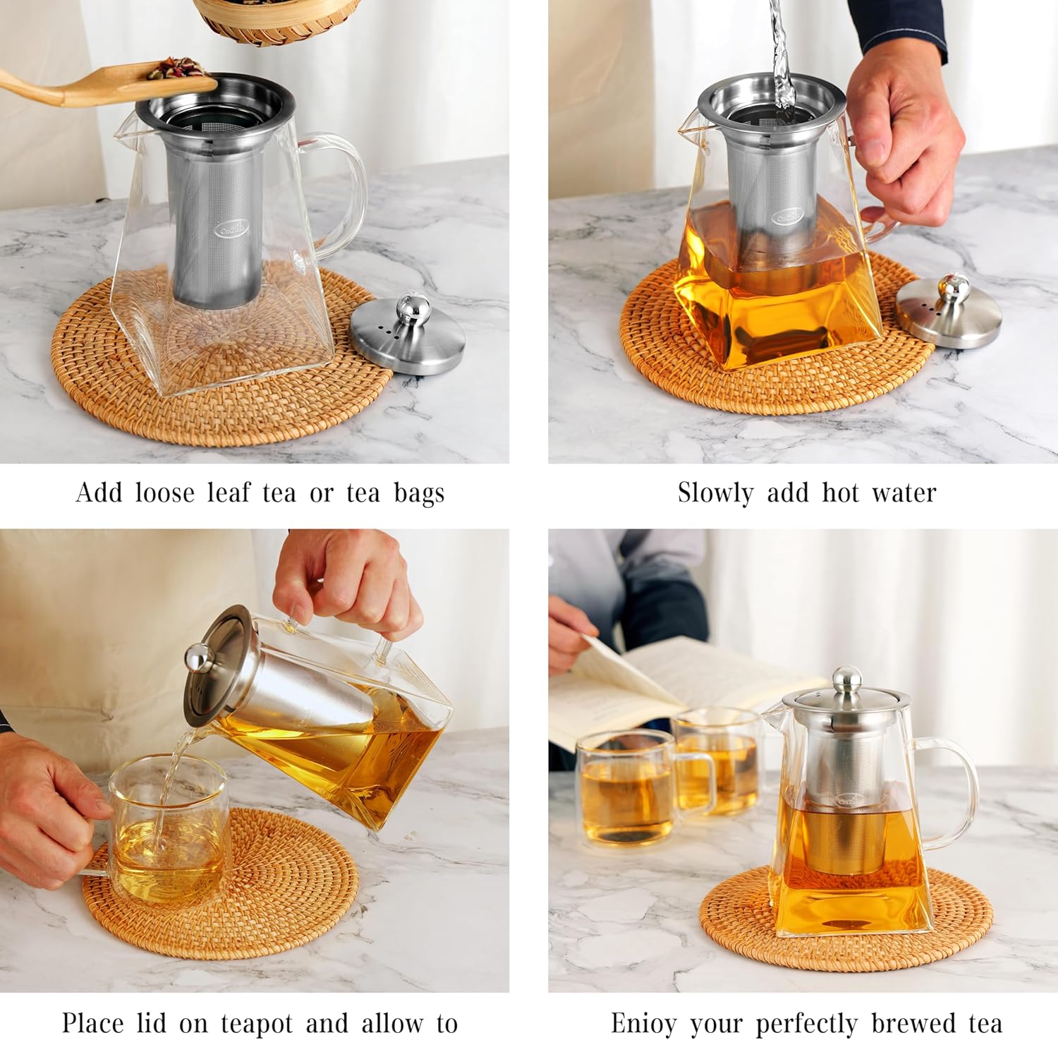 - REMOVABLE INFUSER:Made of 304 stainless steel.It is easily rinsing and cleaning.The lid fits the tea infuser both when inserted or removed.