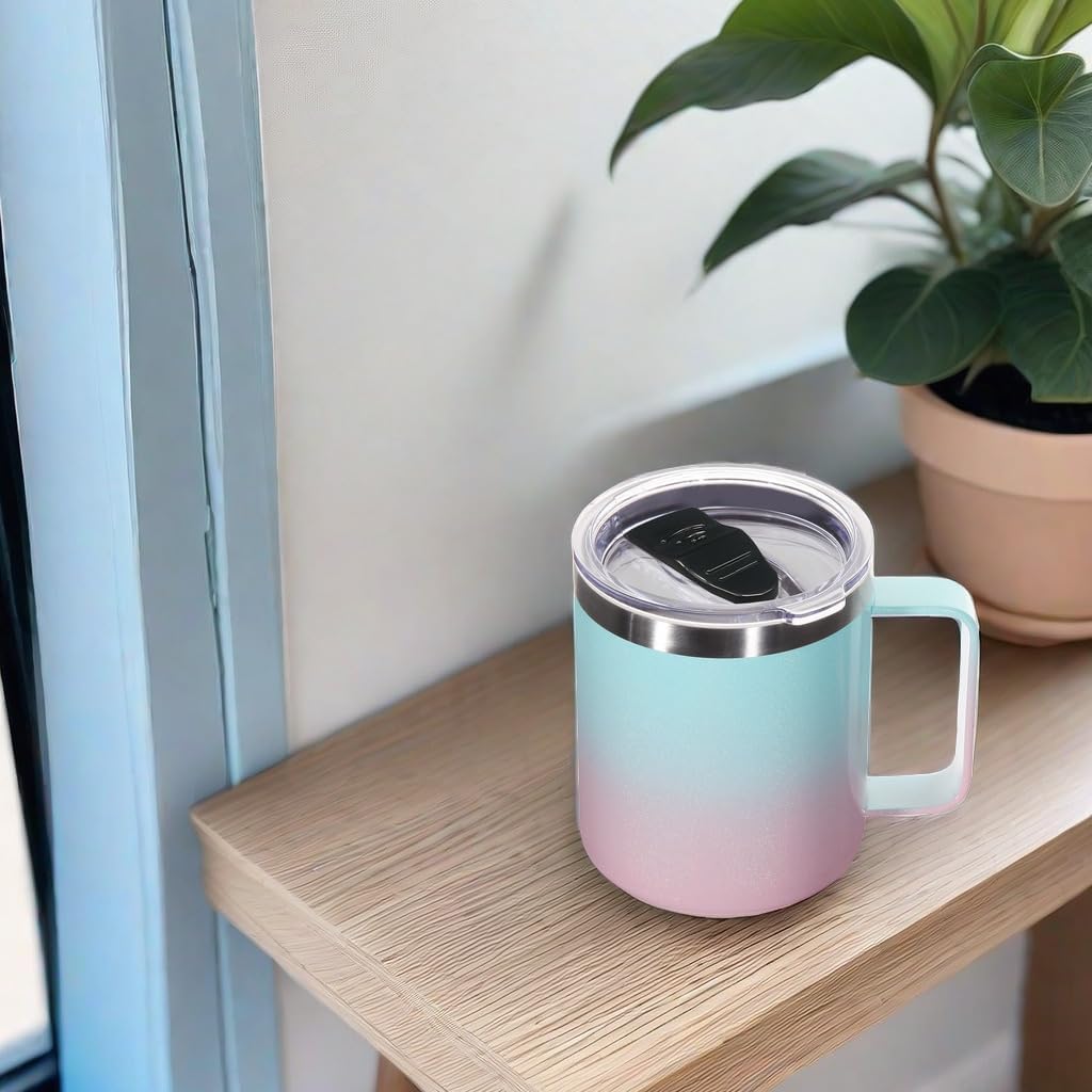 Volhoply 14oz Insulated Stainless Steel Coffee Mug with Lid Bulk 2 Pack,Double Wall Vacuum Travel Coffee Cup with Handle,Reusable Cups Tumbler,Camping Mugs Keep Hot,Ideal Gifts(Green Pink,2)