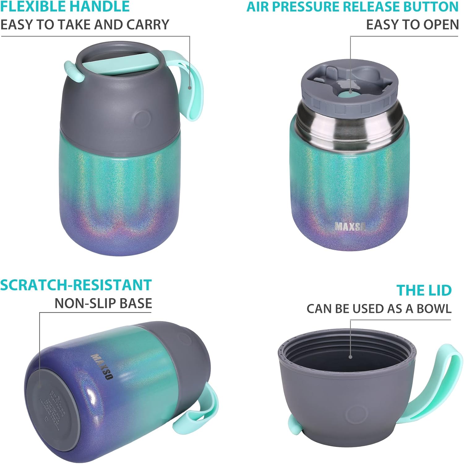 - 【Superior Vacuum Insulation】Keeping your soup hot, it can be an easy thing!!! Durable insulated thermal technology maintains temperatures for longer, interior is constructed entirely of food-grade stainless steel, keeping food hot up to 12 hours or cold for 24. Whether in school or in the office, you can always enjoy hot food and soup during lunch time! It is suitable for babies, toddlers, children, girls, boys, adults and the elderly, perfect for school, office, travel, camping, gym, home.