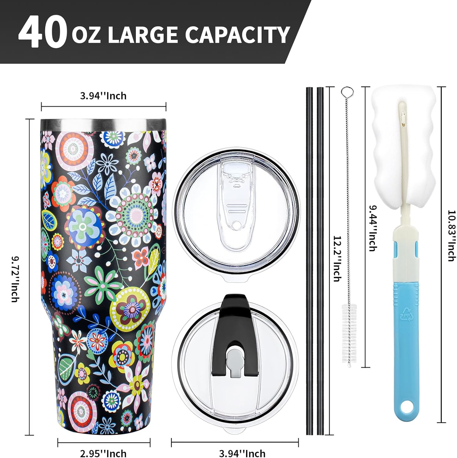 40 oz Tumbler with Lids and Straws, Stainless Steel Insulated Coffee Tumbler, Double Wall Vacuum Insulated Travel Mug Cup, Leakproof Thermal Coffee Cup for Hot and Cold Drinks (Flower)