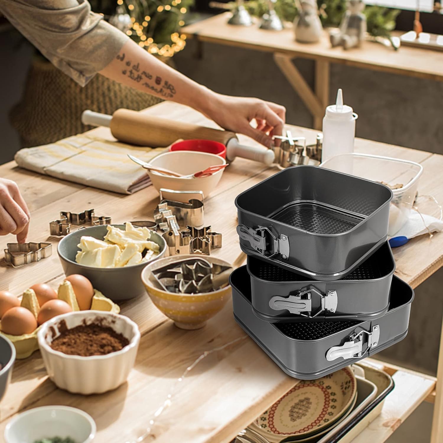 Springform Cake Pan Set of 3 (4, 7, 9 Inch) Square Leakproof Nonstick Cheesecake Pans with Removable Bottom Carbon Steel Bakeware