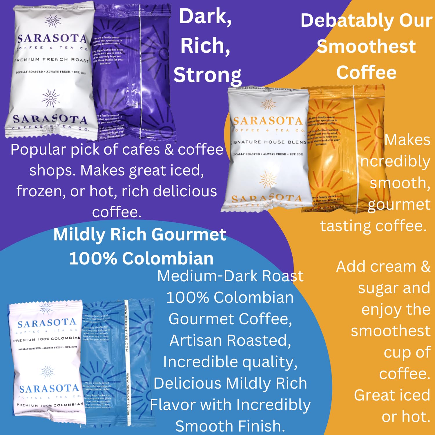 Sarasota Coffee Ground Packets | Gift Set Assorted Variety Sampler Packs | Medium, Colombian, & Dark Roast | Gourmet Low Acid Mold Free Individual Pouches for 12 Cup Coffee Maker | 2 Oz Bags, 12 Count