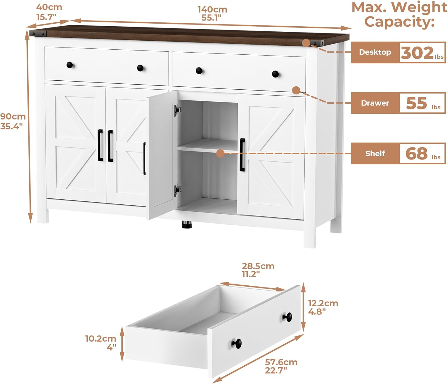 55" Sideboard Buffet Cabinet with Storage, Coffee Bar Cabinet with 2 Drawers and 4 Barn Doors, Long Storage Cabinet Modern Farmhouse, White Wood, for Kitchen, Dining Room, Living Room