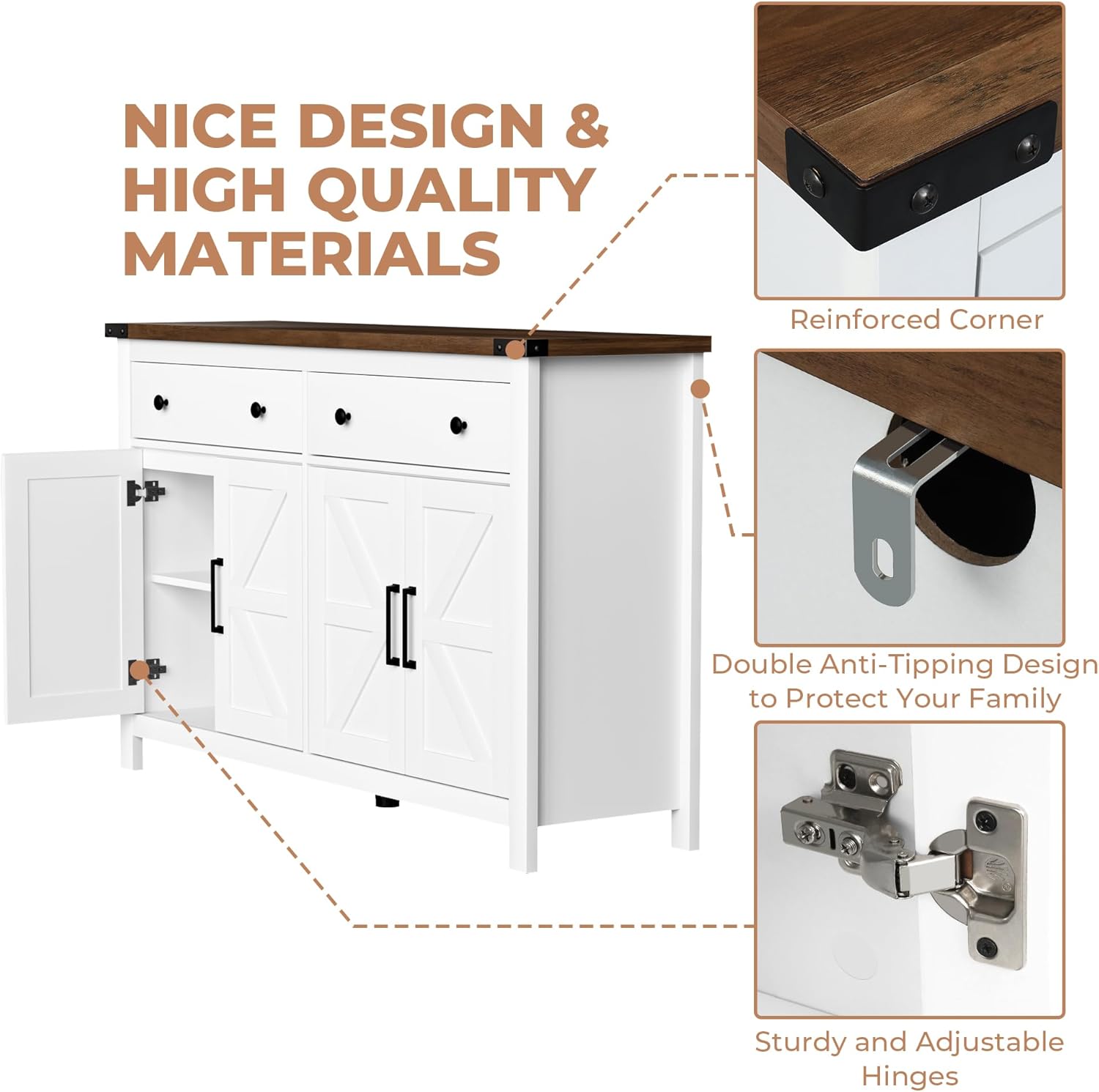 - 【Better Wood】Thicker and Denser Wood. The coffee bar cabinet with 2 drawers and 4 barn doors is made from thicker MDF wood.The material with higher density is sturdier and smoother, largely reducing the likelihood of scratching, peeling and cracking.