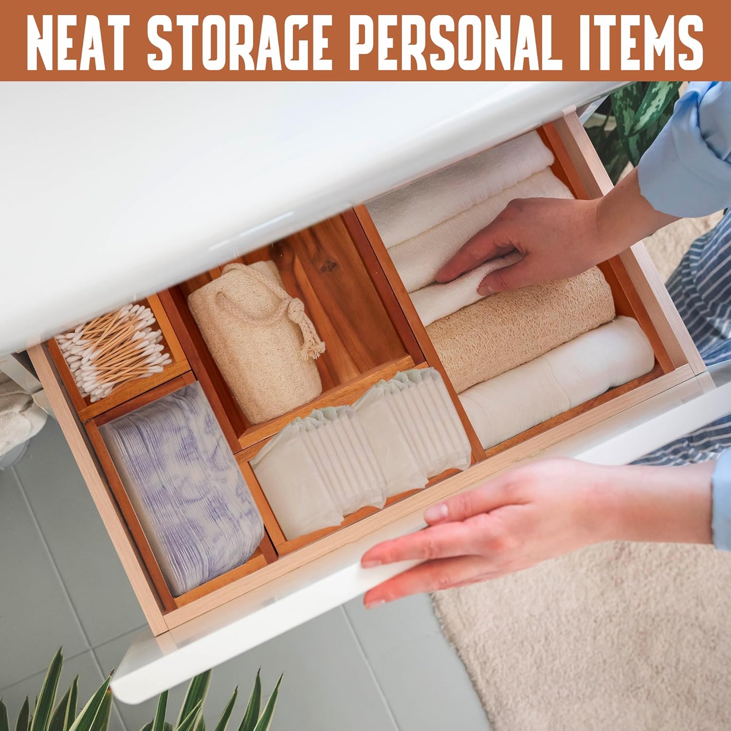 - Different Sizes for Utensil Organizer: The cabinet drawer includes 5 small drawer organizers, each available in different sizes. The compact dimensions of 3.95 x 3.95", 3.95 x 6.5", 3.55 x 6.89", 6.89 x 6.89", and 6.89 x 10.44" make them convenient for use as a vanity organizer, catering to your personal needs. Our wooden boxes can be rearranged to your preference, allowing you to organize these storage bins individually or as a set. Feel free to mix and match the inserts to perfectly suit your spaces.