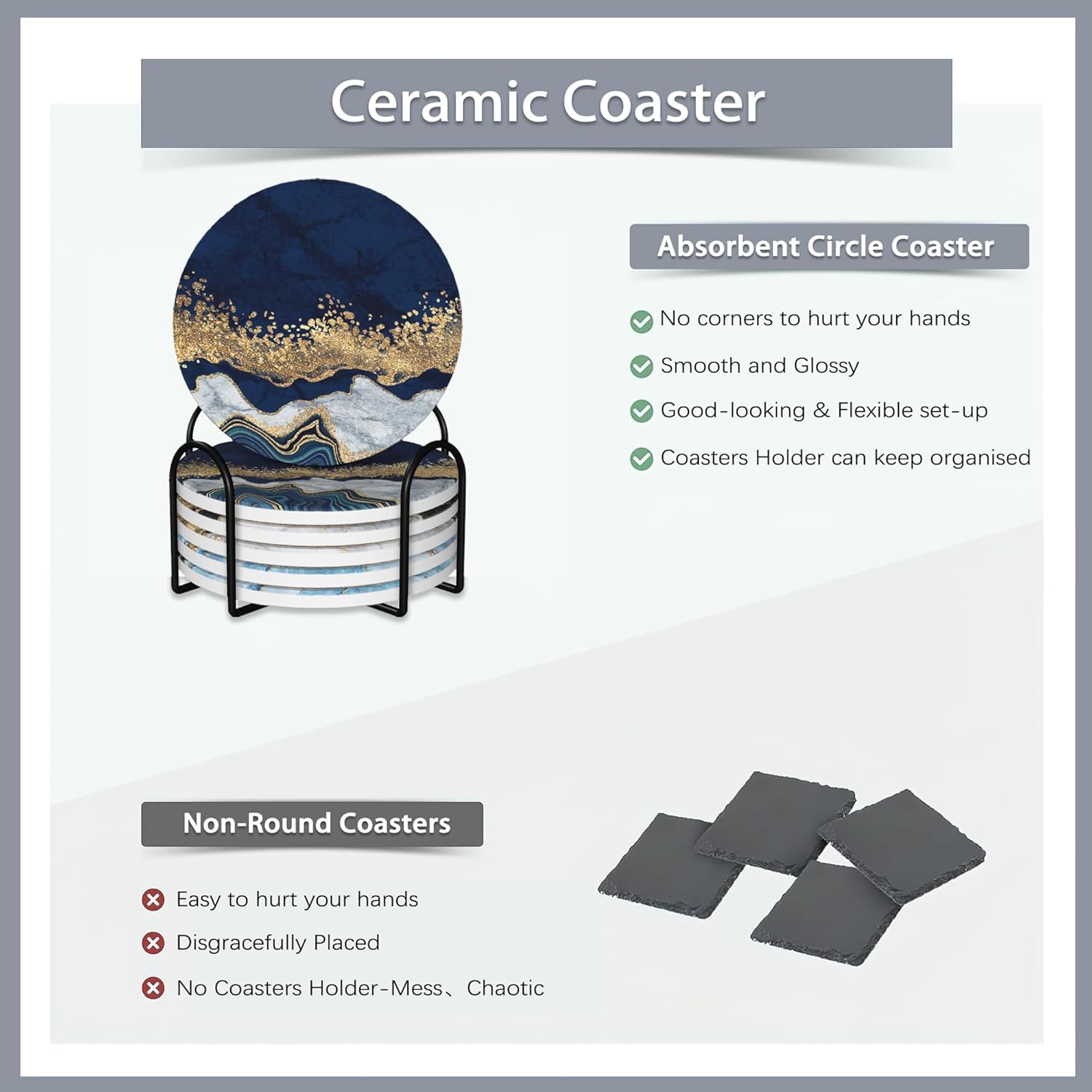 - 【Coaster with Metal Holder Set】The set includes 6 round ceramic coasters and metal coaster holder.