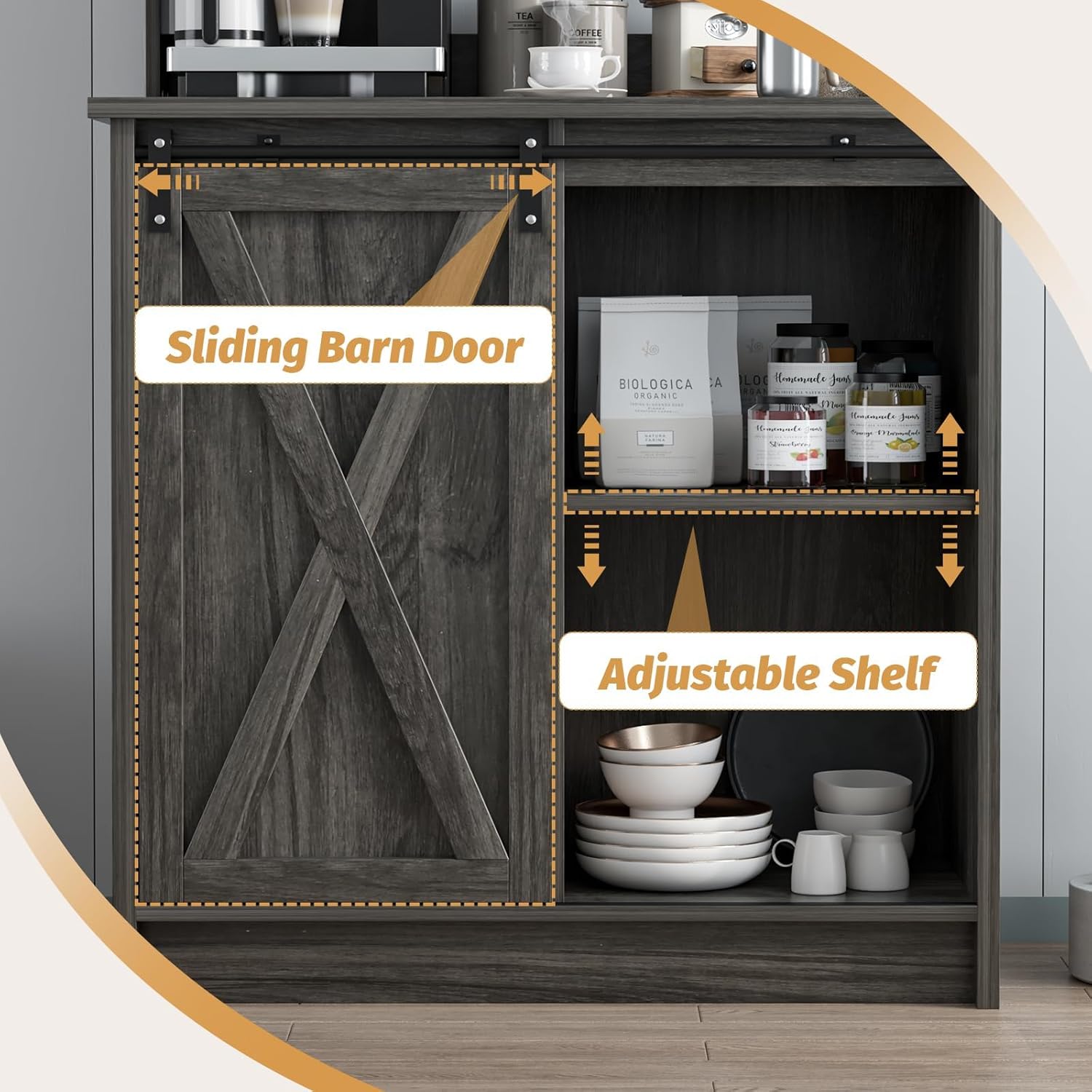 - FARMHOUSE WITH CLASSIC COFFEE BAR: The coffee bar with X design sliding barn door is easy to pull left and right, its design is classic and uncluttered. The coffee bar cabinets feature a white and yellow wood-grain color scheme for a farmhouse modern look