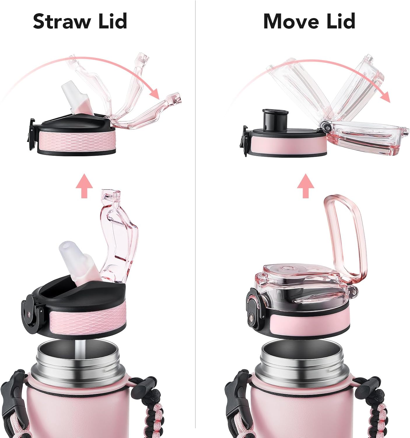 - Insulated water bottle 24 oz: 24 oz insulated water bottle has a matte finish and comes with 2 lids (Lid with Straw/No Straw) and a Paracord handle for easy portability; Its wide mouth makes it easy to fill, pour, and clean, and the leak-proof cap ensures worry transport.