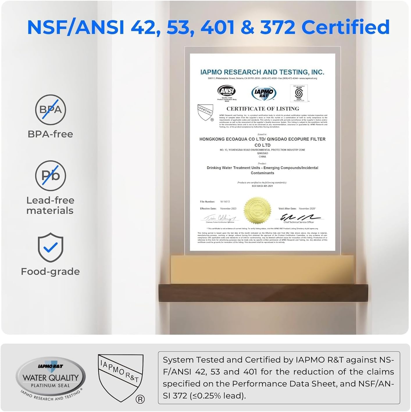 - [NSF/ANSI 42, 53, 401 & 372 Certified] The filtered water pitcher has been certified by IAPMO against NSF/ANSI 42, 53, 401 & 372 standards to reduce 45+ substances including chlorine, lead, mercury, benzene, bisphenol A and more. It also has been tested by a third-party lab to reduce PFOA, PFOS, ensuring high-quality drinking water.