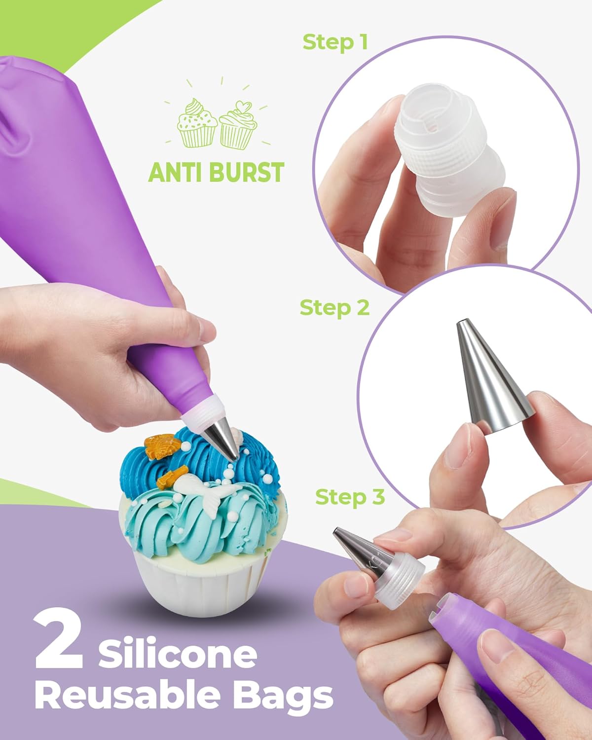 - Essential Cake Decorating Kit: 24 numbered & easy to use stainless steel piping tips, 2 reusable piping bags, 3 shapes of cake scraper, 2 reusable converters, 1 flower nail, 1 storage box that keeps everything organized. With just a few key baking tools, you'll be able to make cake decorating a piece of cake.